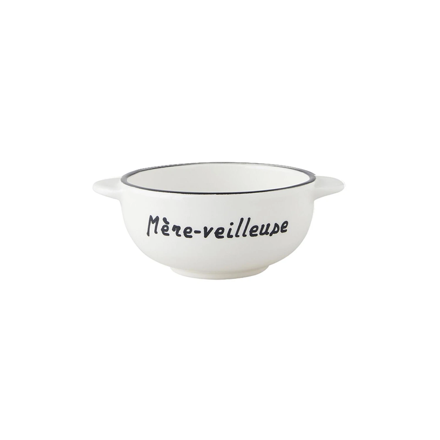 Toute en élégance, le bol MERE-VEILLEUSE suit une fabrication traditionnelle et artisanale française. L’écriture, tout comme le filet noir, a été soigneusement peinte à la main. Elle ressort encore davantage sur le fond blanc de ce bol breton à oreilles.