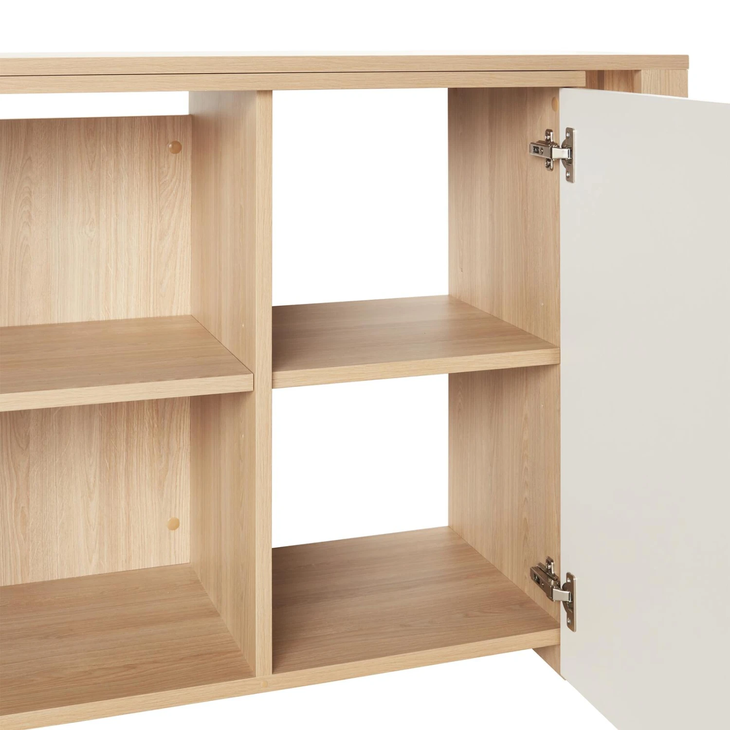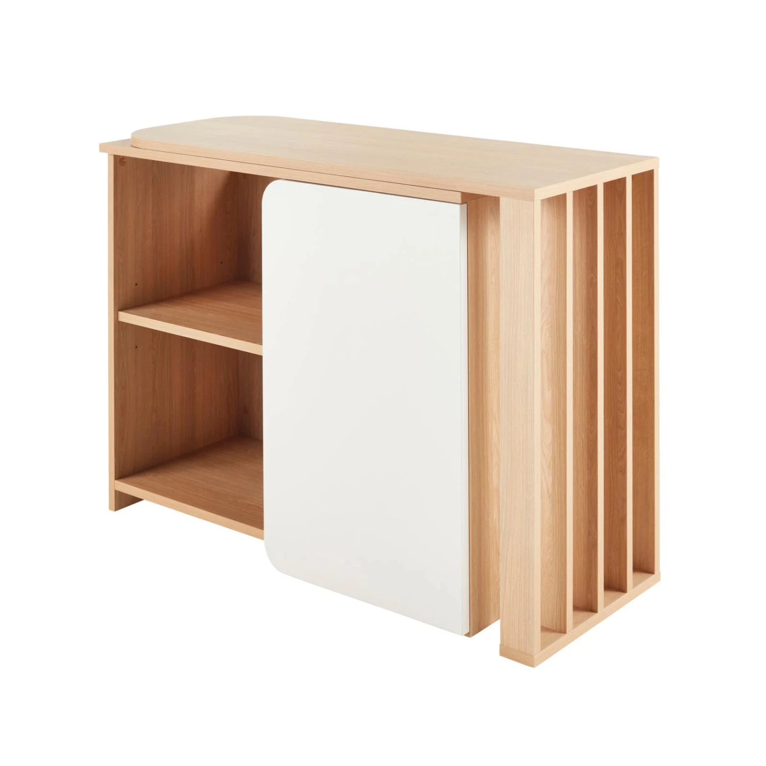 Ce bureau couleur pierre de lune est doté de deux étagères extérieures de rangement auxquelles vous pourrez accéder facilement. À celles-ci s’ajoutent deux autres étagères, protégées cette fois par une porte.