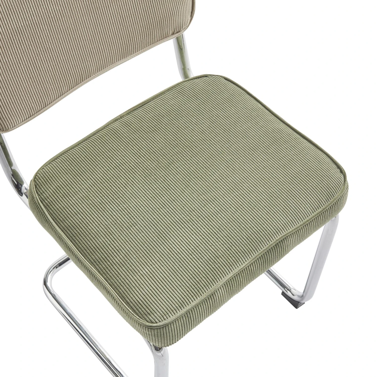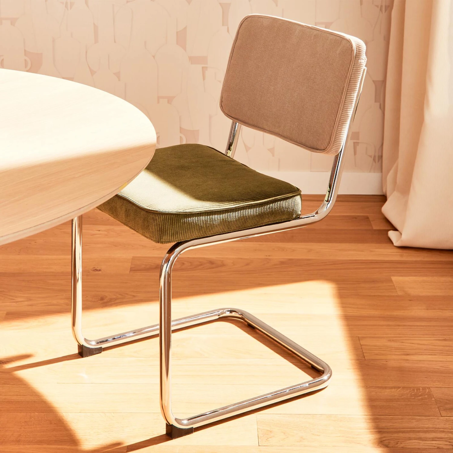 L’irrésistible aspect rétro de cette chaise, qui rappelle aussi les salles d’attente, est amplifié par sa couleur. Son dossier est beige et son assise arbore une teinte vert olive. Ces deux nuances douces, ainsi que les lignes du velours côtelé, apportent à cette chaise ce style vintage si charmant.