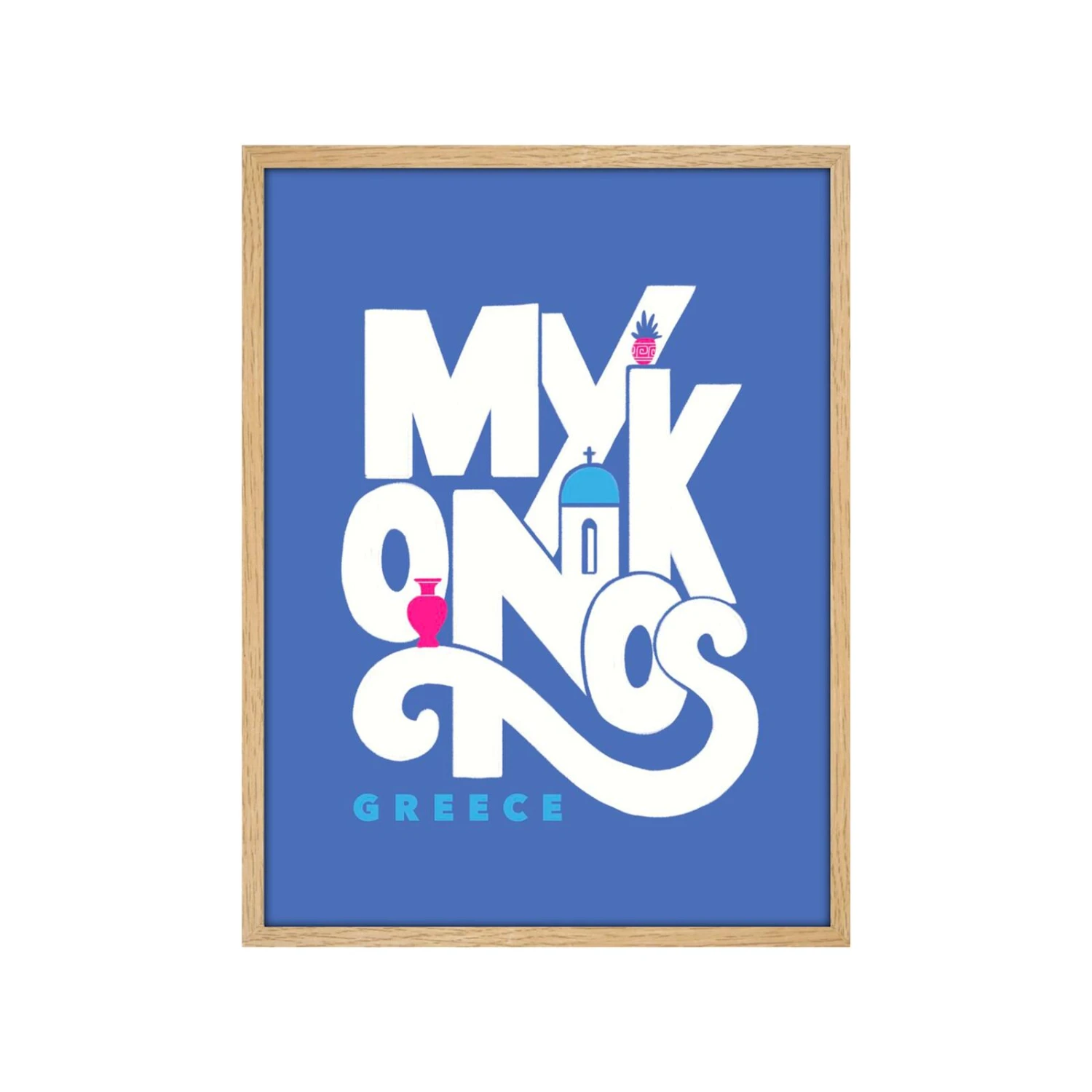 Bon, maintenant que c’est fait, passons à autre chose et intéressons-nous plus en détail à cette affiche encadrée composée de MDF, de verre et de papier lisse. Mesurant 45 par 30 centimètres, elle possède un fond bleu sur lequel apparaissent le nom « Mykonos » en grosses lettres blanches, ainsi que le nom « Greece », inscrit juste en dessous en bleu clair et en petites majuscules.