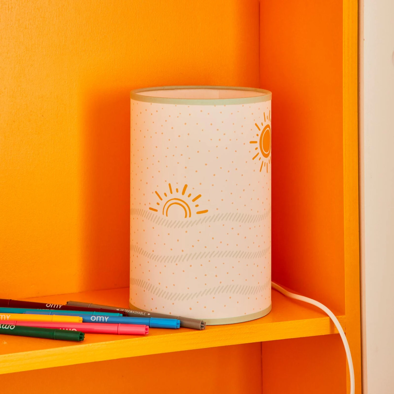 La lampe de chevet SOLEA se teinte de couleurs tendres. Le blanc, l’ocre et le bleu doux se marient dans un motif de soleil couchant sur l’eau. Grâce à sa matière backlight, la luminosité qu’elle produit est diffuse. La puissance de l’ampoule LED de 40 W apporte une lumière pas trop forte, parfaite pour éclairer les dernières activités d’un petit fatigué !