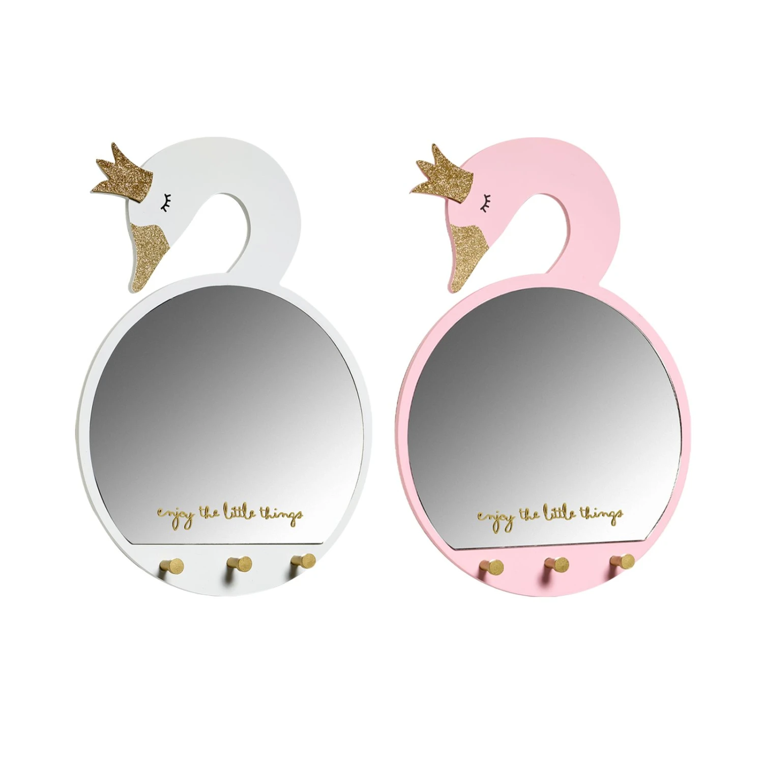 Pratique et décoratif, le miroir patère en forme de cygne dispose de trois crochets dorés. Au choix dans les tons rose ou blanc, parsemé de petites touches dorées pailletées, il sera l’accessoire idéal pour parfaire une chambre de jeune fille sur le thème du ballet classique.