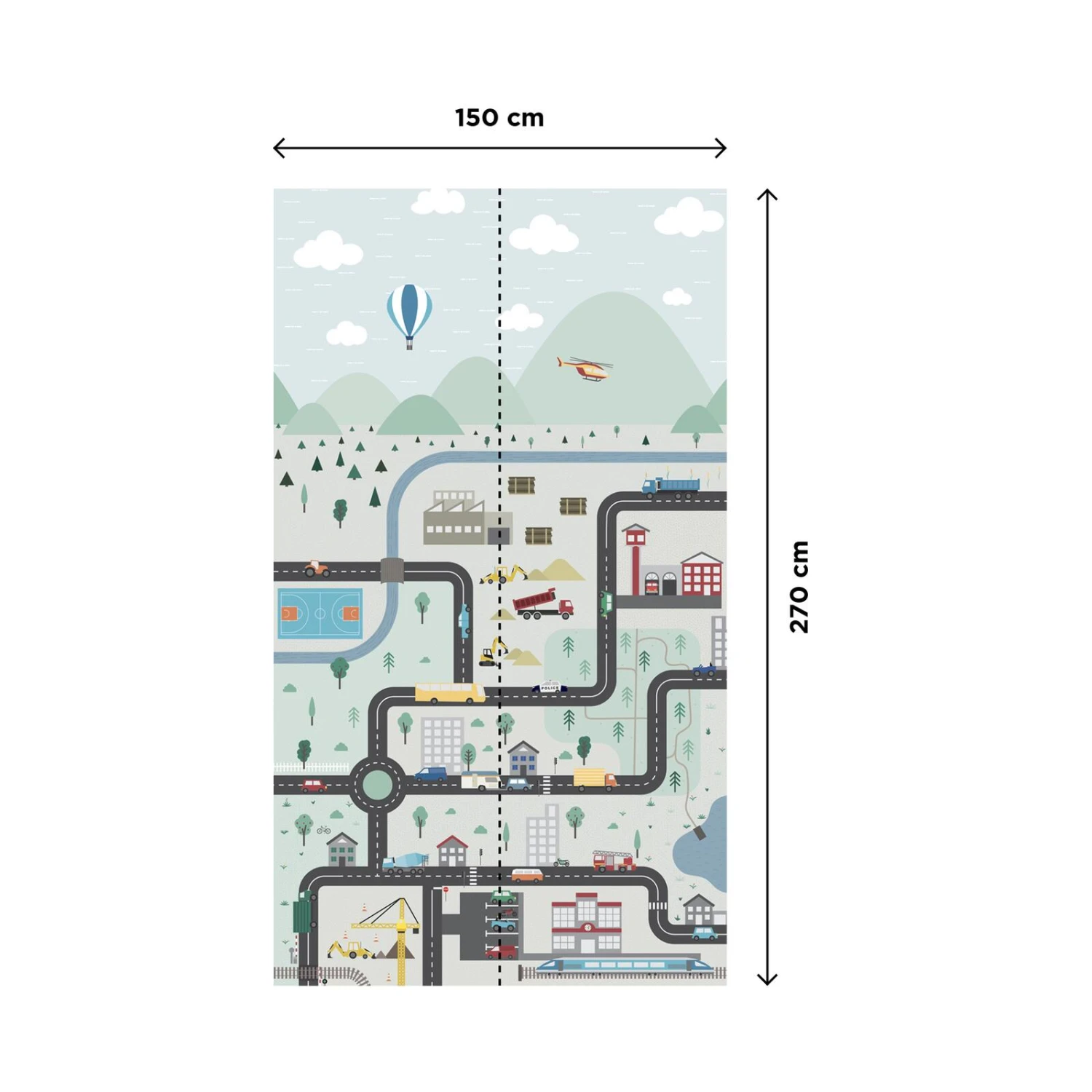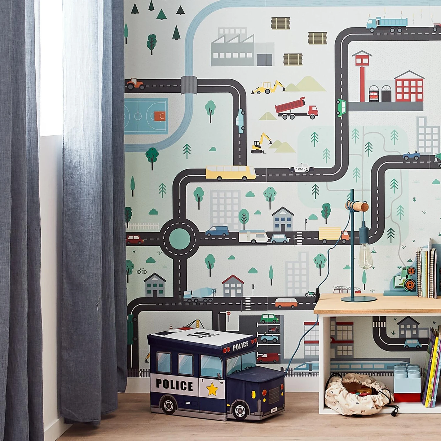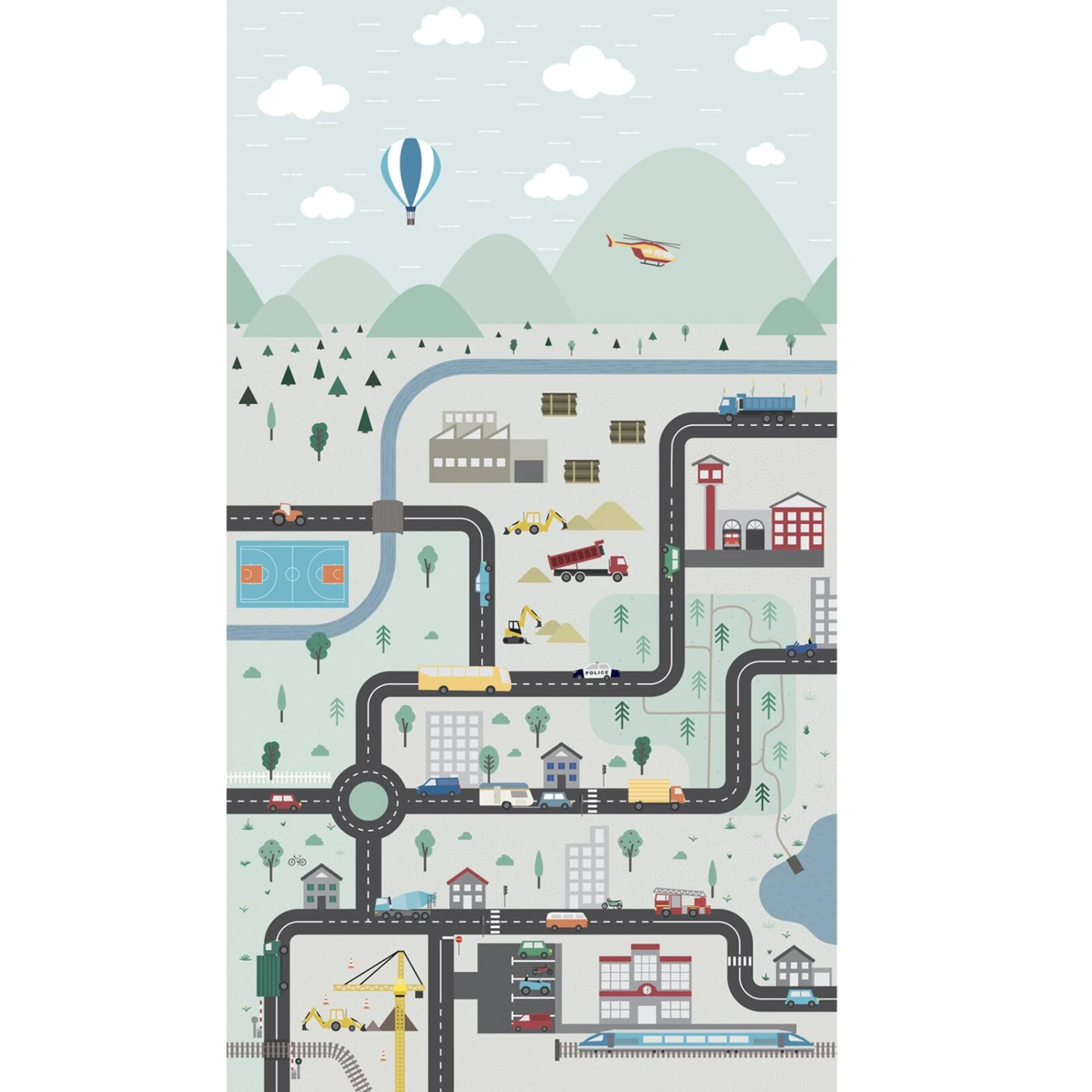 Camion, tracteur, bus, engin de chantier, véhicule de secours, terrains de jeux, maisons, forêts et rivières sont représentés dans un style graphique et ludique. Tout y est pour apporter une dimension joyeuse et colorée aux murs de son espace de jeu favori.