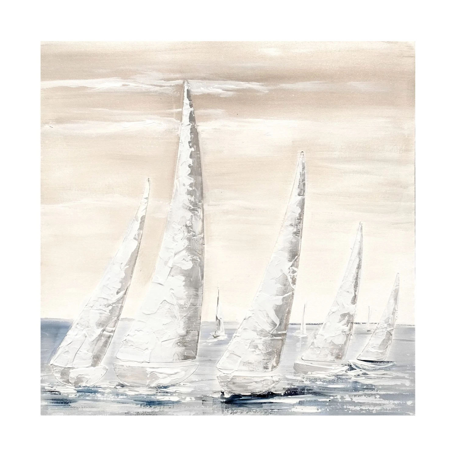 Les voiles blanches des bateaux se détachent sur un fond pastel et instaurent une atmosphère apaisante.