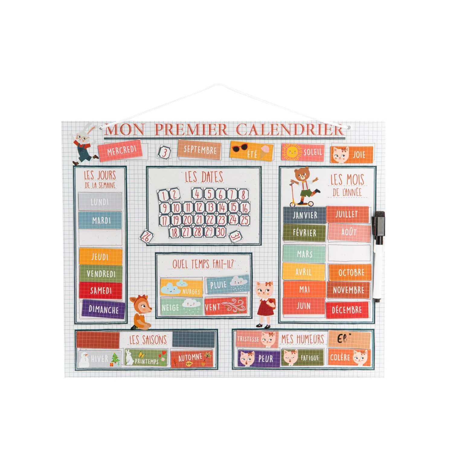 Ce calendrier coloré permet de prolonger cette routine à la maison. Jouer à placer les magnets, c’est une façon originale de l’accompagner dans son apprentissage des jours de la semaine, des saisons, de la lecture et des chiffres, de la météo et aussi de ses humeurs. Créatif et éducatif, l’accessoire mural MON PREMIER CALENDRIER est idéal pour favoriser l’autonomie et la confiance de votre enfant.