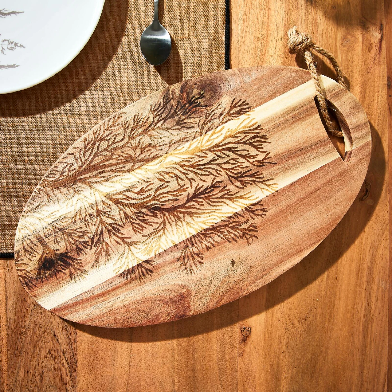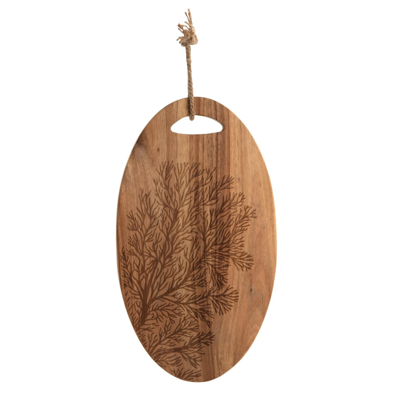 En bois d’acacia, cette planche à découper de forme ovale est joliment décorée grâce aux formes de coraux qui se dessinent sur elle.