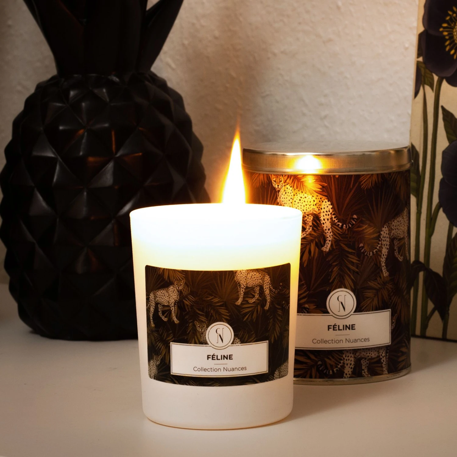 Craquez pour cette sublime bougie parfumée ! « Féline », un mariage subtil de notes florales et sensuelles pour une senteur aux accents de vanille, de lys et de chocolat.
