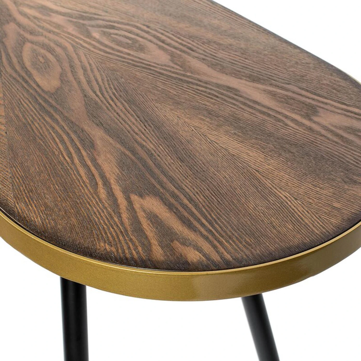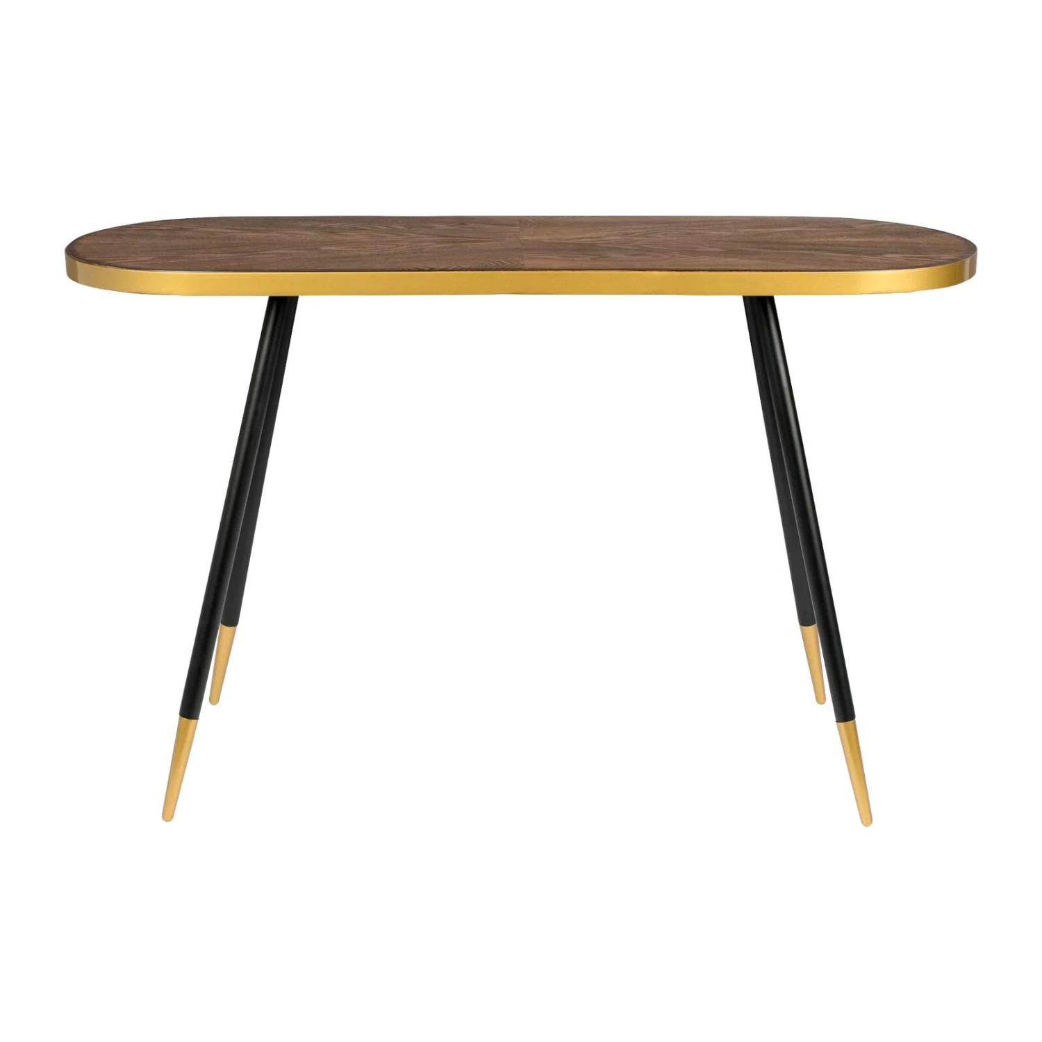 Cette console est composée d’un plateau MDF en frêne teinté d’une couleur noyer. Le plateau est cerclé avec du fer peint en doré. Enfin, la console dispose de pieds en fer thermolaqué dont les extrémités sont également teintes en doré.