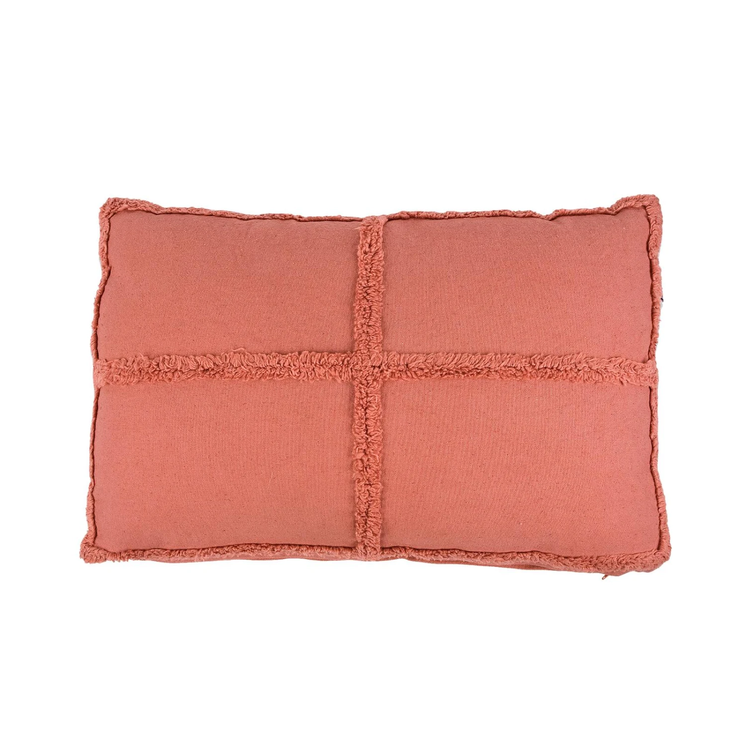 Ce coussin déhoussable de forme rectangulaire affiche en effet une jolie teinte orange clair. Uni, il arbore néanmoins des bouclettes toute douces formant une croix, mais aussi l’encadrant tout entier. Ce détail lui donne un aspect très douillet et nous incite à y faire glisser nos doigts.