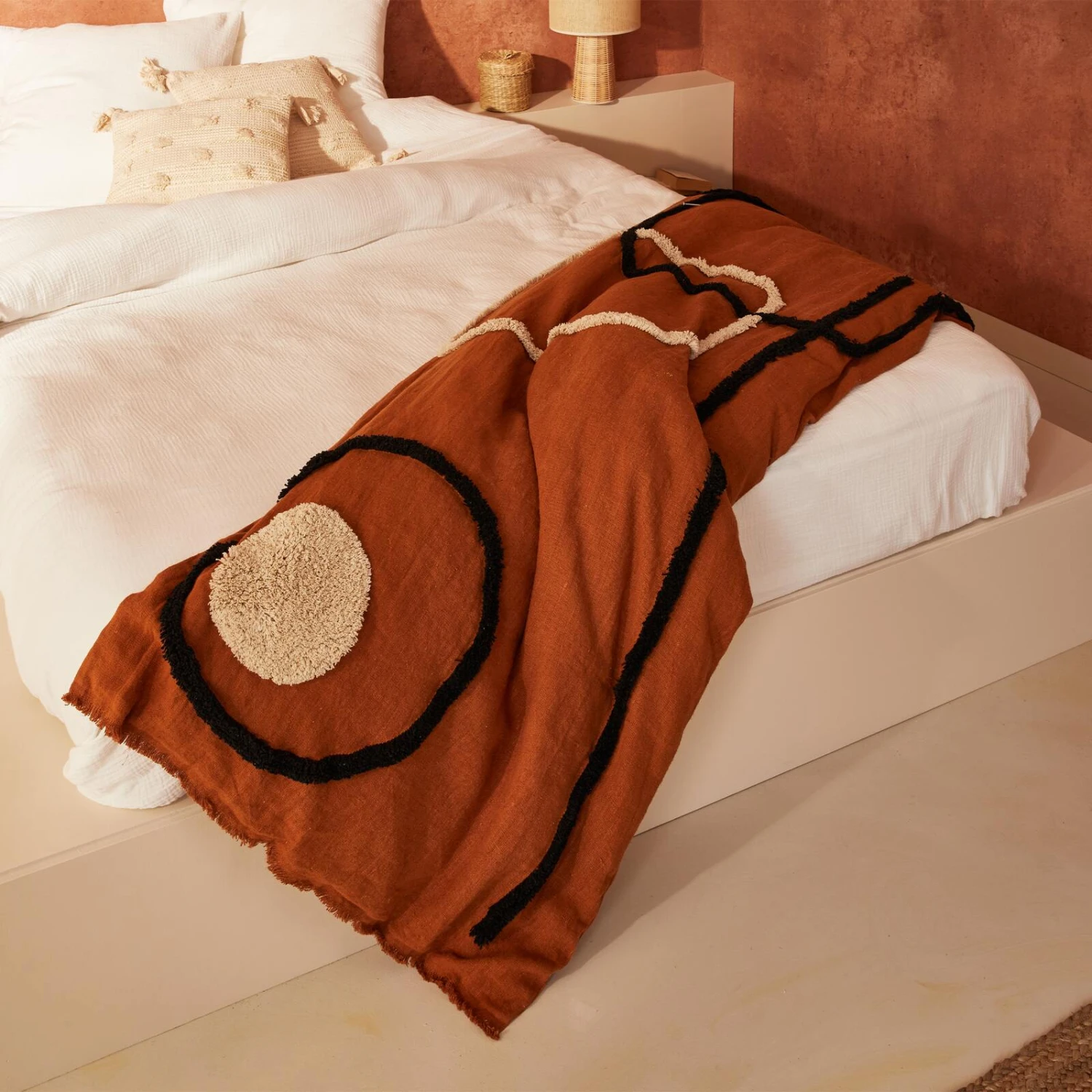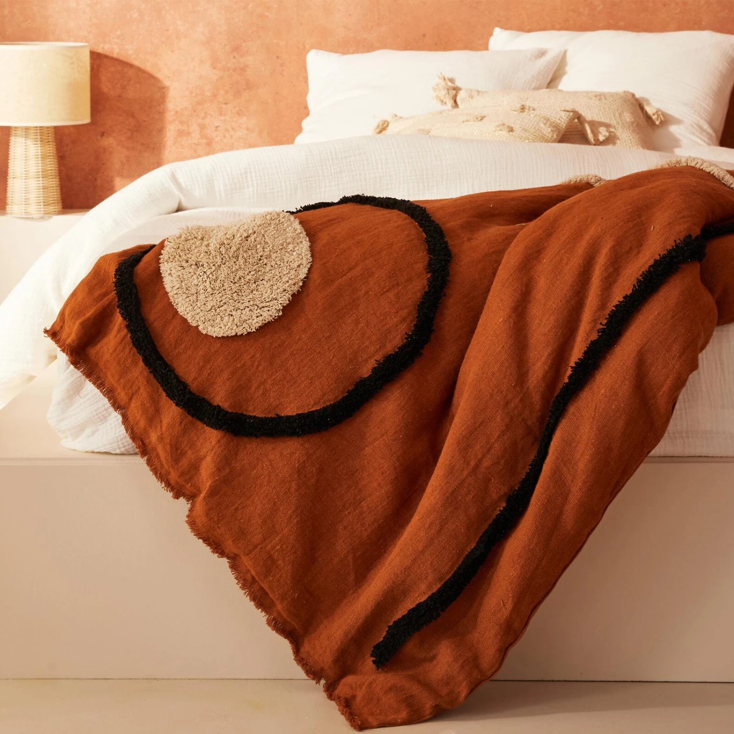 Très originale avec ses motifs abstraits, cette housse aux broderies tuftées et aux franges audacieuses apportera à votre édredon un style unique. De plus, si l’une de ses faces est composée de coton, l’autre est fabriquée en lin, matière thermorégulatrice par excellence qui vous maintiendra bien au chaud !