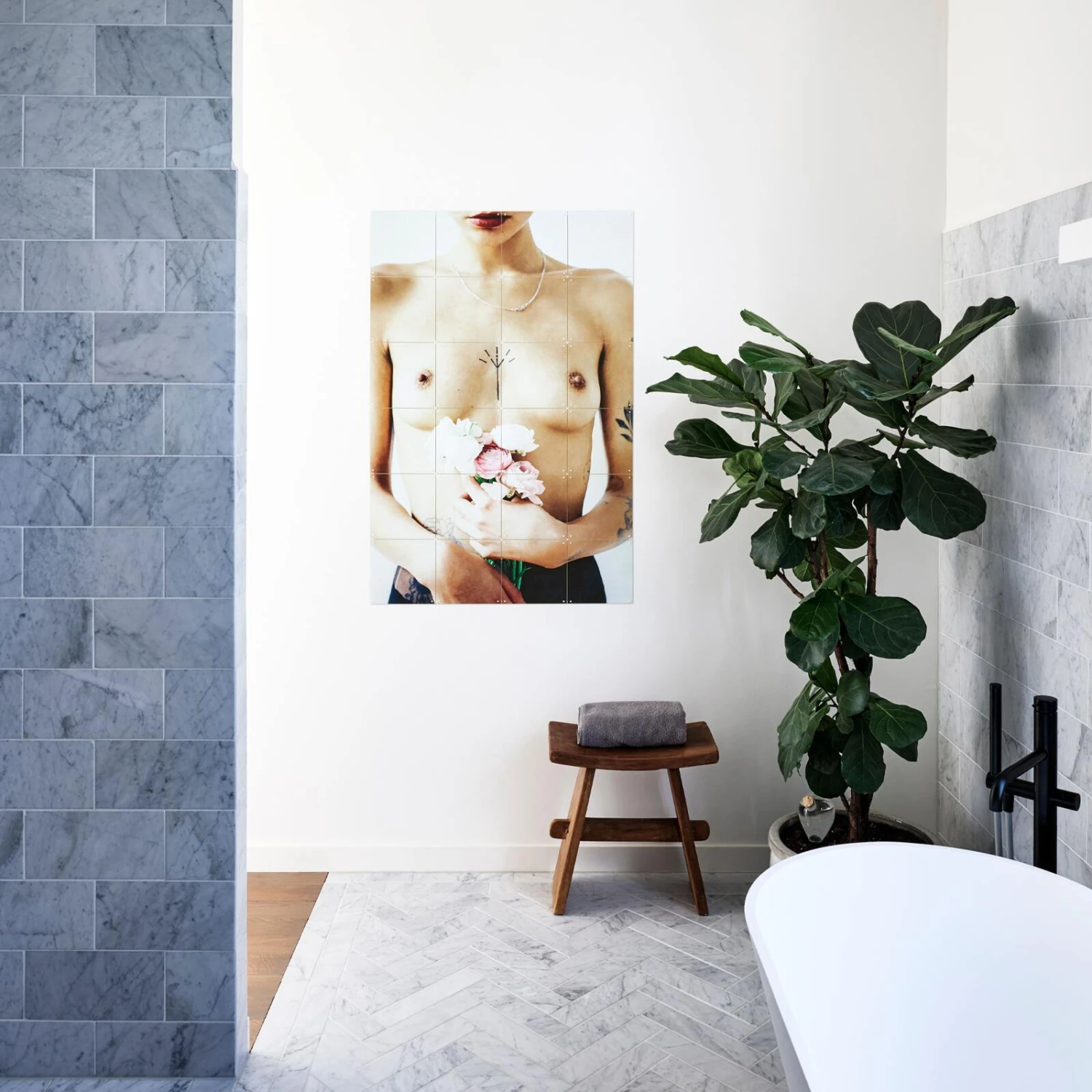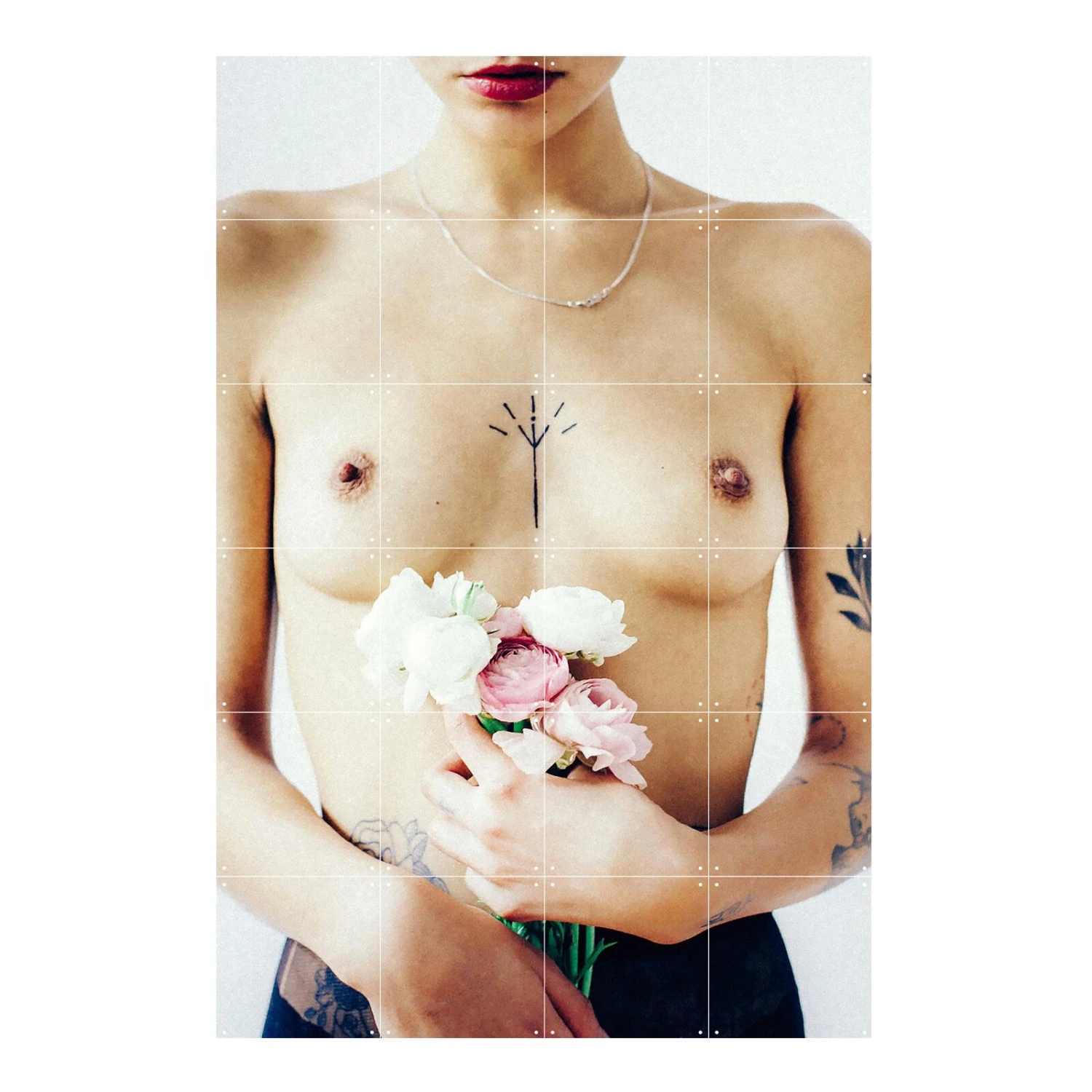 Cette image de femme à demi nue tatouée, vêtue de lingerie, le tout dans un esprit grunge rock and roll, ne vous laissera pas indifférent ! Ce panneau est décoré des deux côtés, un côté où la poitrine tatouée de cette femme est mis en avant avec un bouquet de fleurs qu’elle tient à la main et un coté où on l’appercoit de dos. Cela vous permettra ainsi de jouer avec les contrastes et de changer votre déco au grès de vos envies.