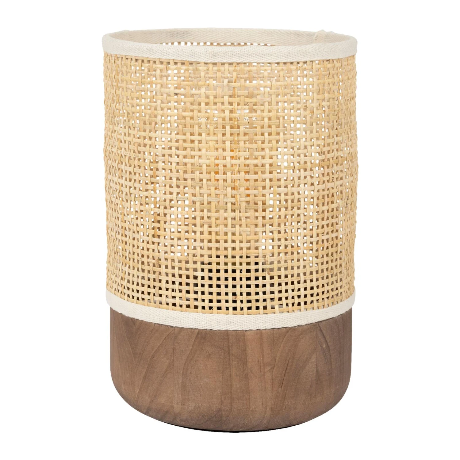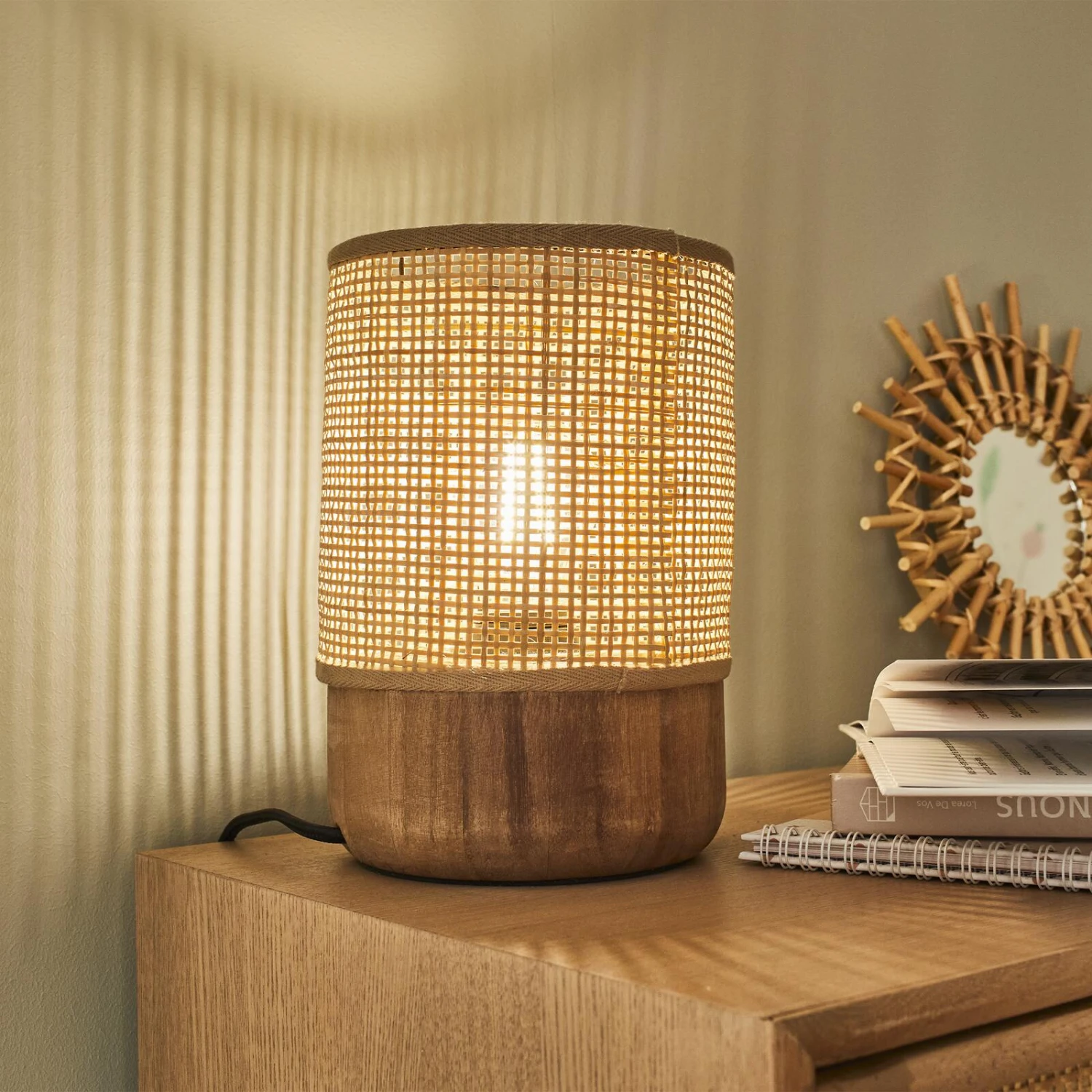 Cette lampe est composée d’une base en bois surmontée d’un cylindre en rotin. Celui-ci cache l’ampoule dont la lumière se diffuse subtilement à travers les ouvertures en forme de quadrillage.