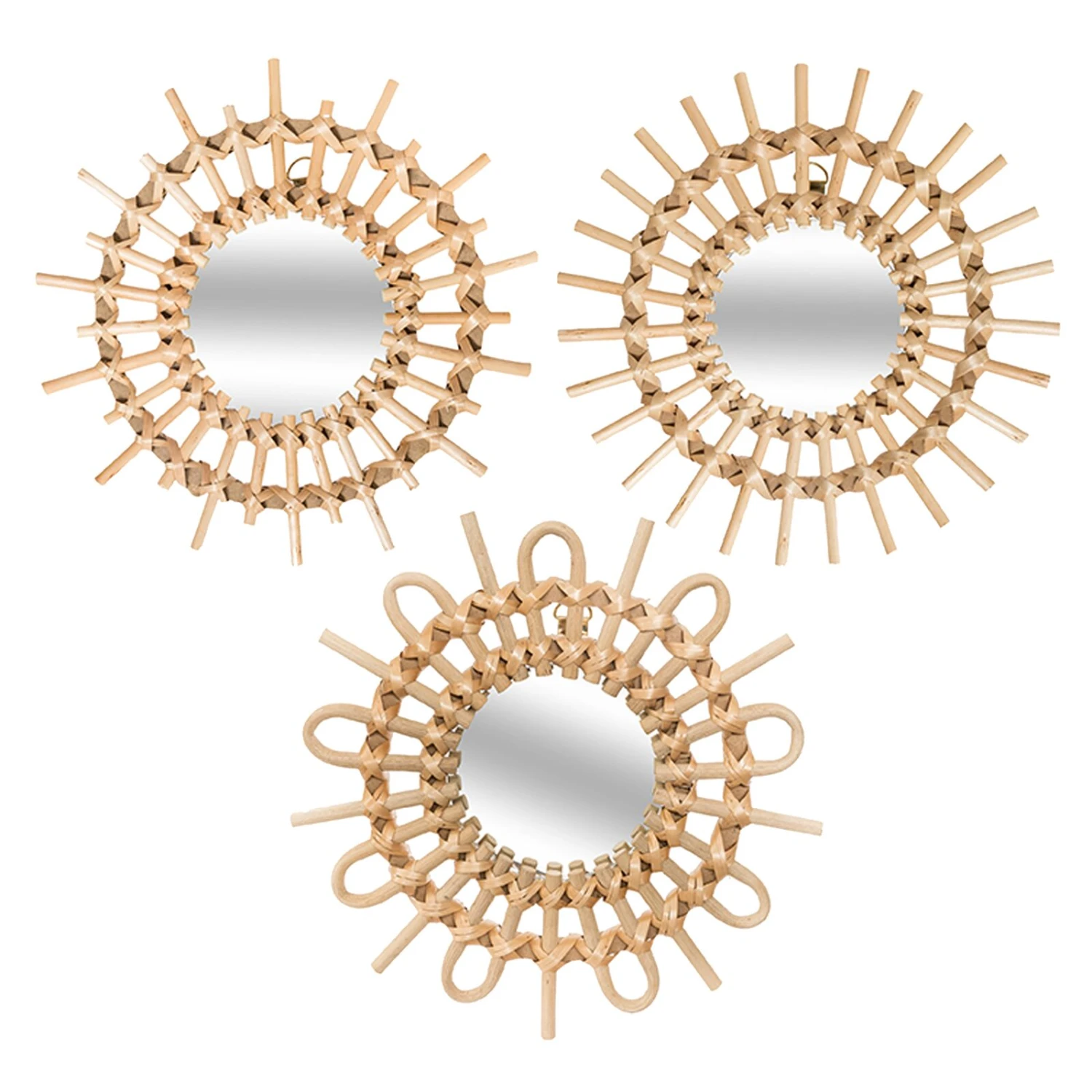 Craquez pour ce set de miroirs en rotin MATAHARI pour votre intérieur ! Élément indispensable de la décoration, cet ensemble apportera une touche ethnique et tropicale résolument tendance à votre déco ! Ces miroirs sont parfaits pour une entrée, une pièce à vivre ou une chambre, ils trouveront forcément une place dans votre logement !
