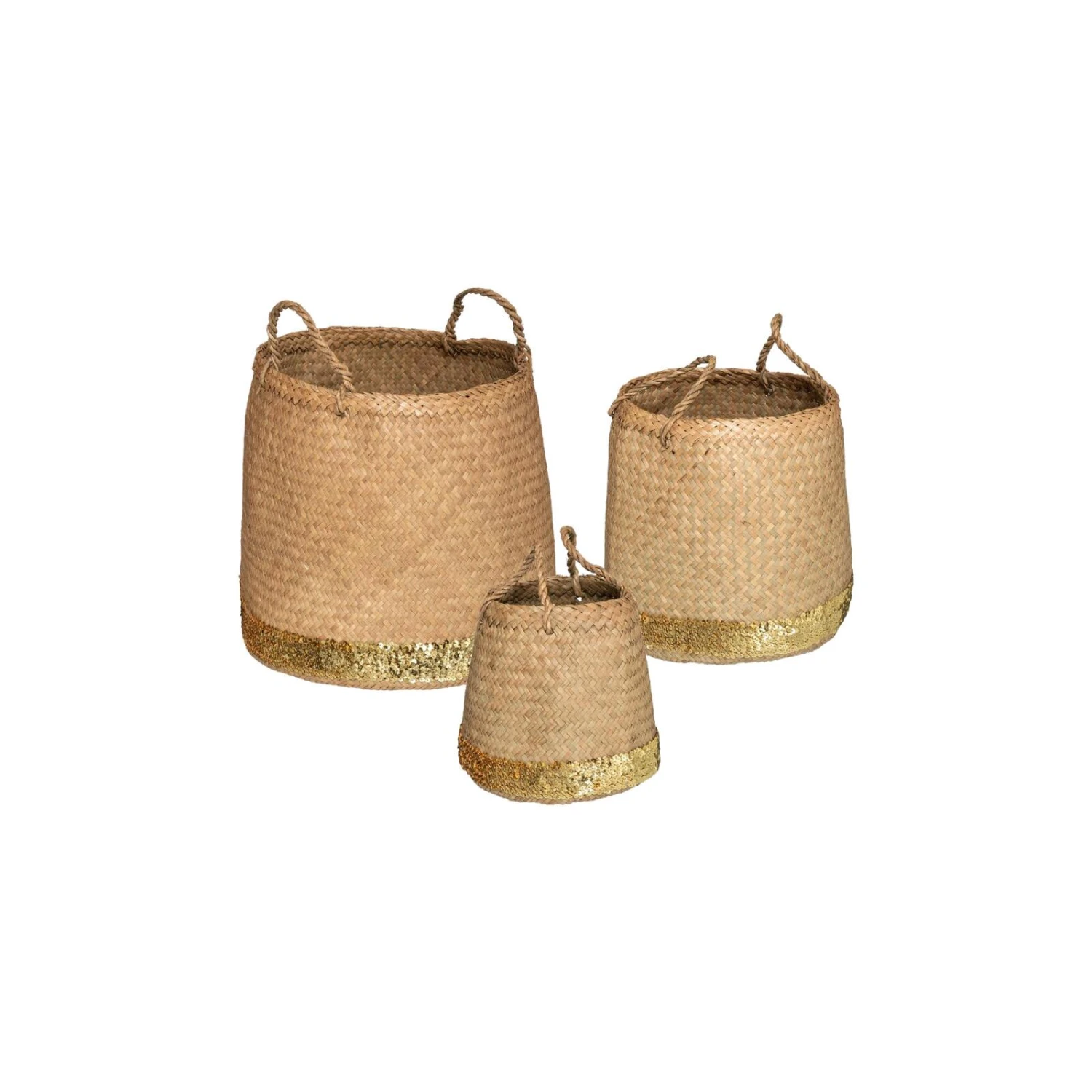 Plus besoin d’aller au souk pour dénicher de jolis paniers en fibre naturelle. Découvrez ce lot de trois paniers en roseau AZORA. Avez-vous remarqué la petite particularité qui les rend singuliers ? Un bandeau de sequins habille leur base et les fait briller de mille feux.