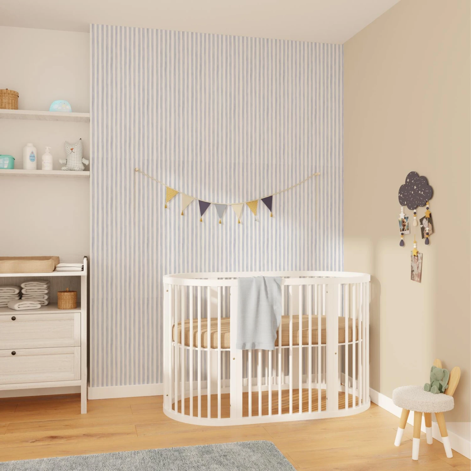 Le motif rayé bleu ciel et blanc est une combinaison de couleurs classique qui est très utilisée dans les chambres d’enfant, et ce n’est pas un hasard !