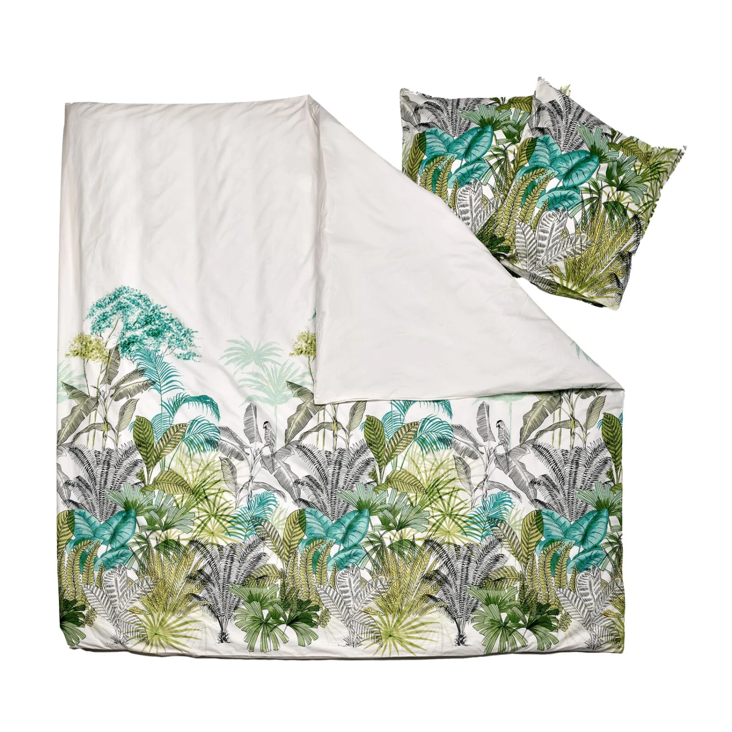 Craquez pour le joli motif exotique et coloré de cette parure BALISIA pour votre chambre. Le motif tropical qui orne ce modèle dans les teintes vertes apporteront un look travaillé et naturel à votre chambre ! Cette parure est fabriquée en percale de coton. La housse de couette est réversible et sa seconde face au coloris blanc vous permettra de varier les styles.
