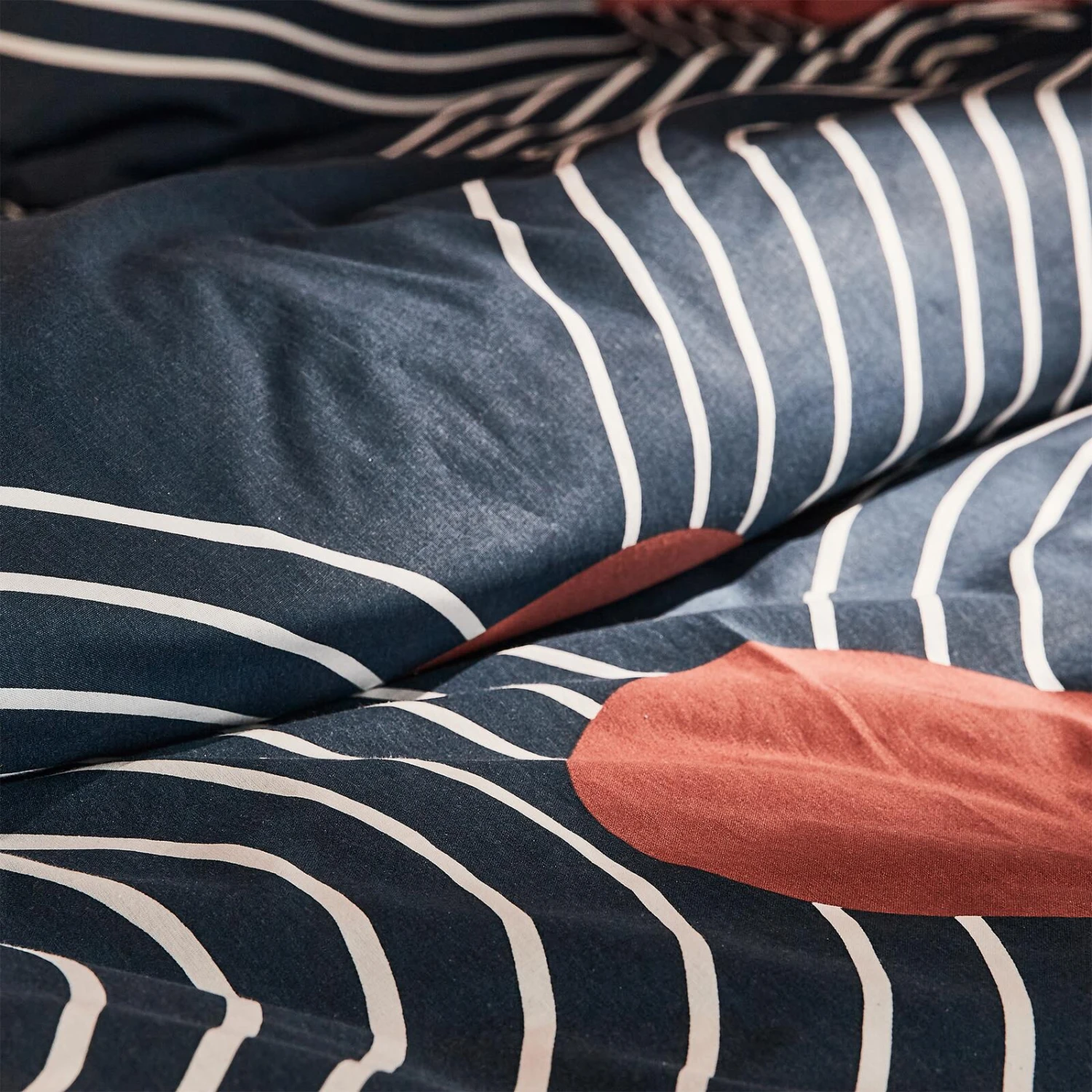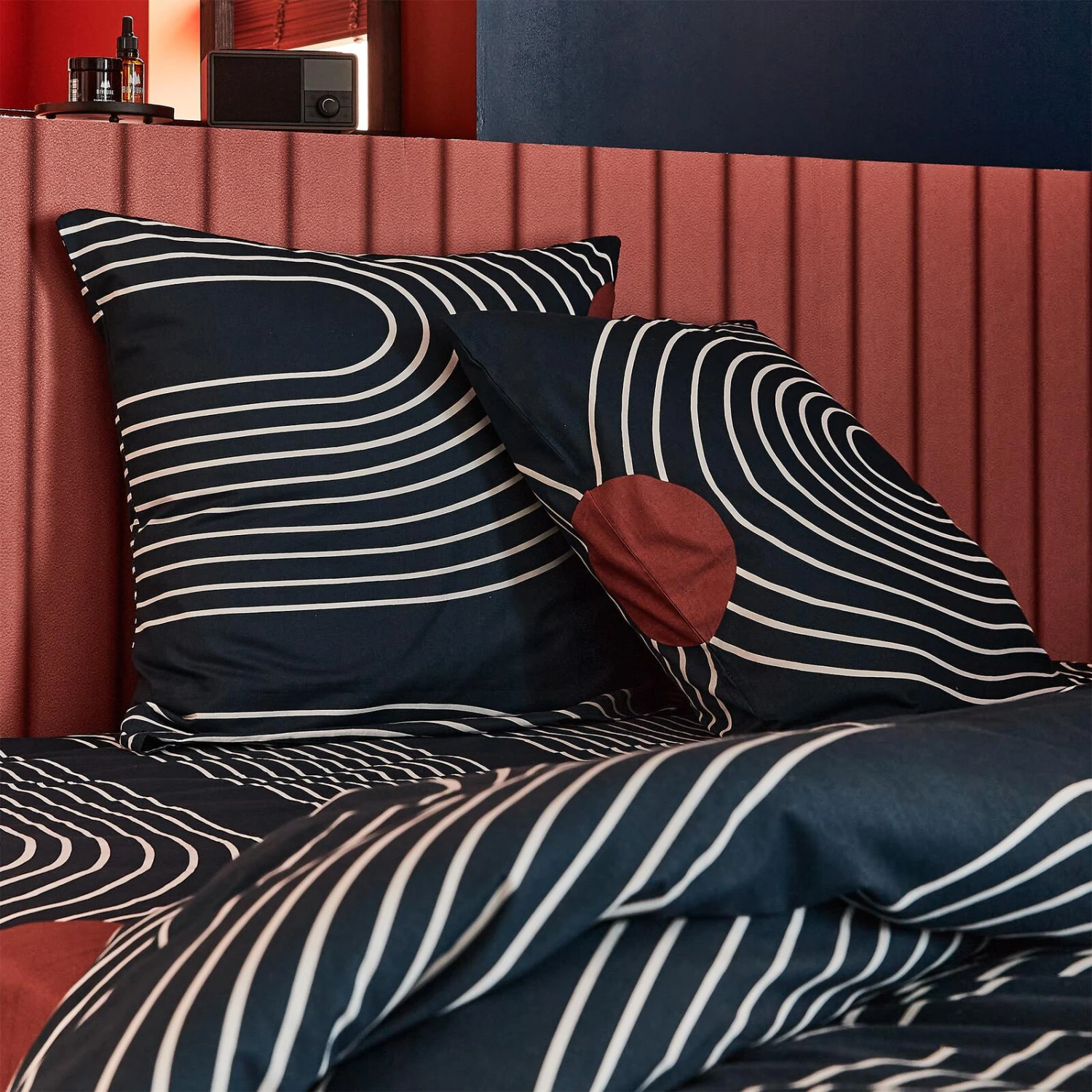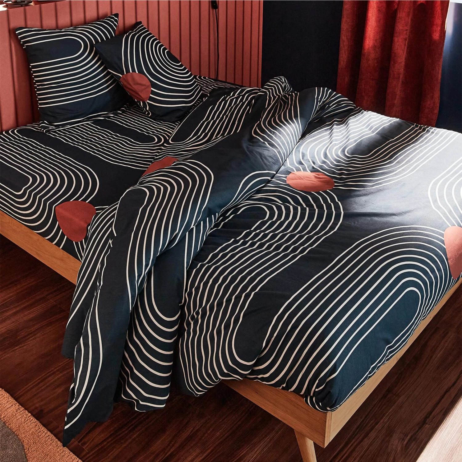 Graphique et tendance, la parure de lit CUTS affiche une couleur profonde bleu marine. Un motif arche, très tendance actuellement, part de chaque côté de la housse de couette et se répète pour donner une sensation de profondeur à ce drap. Des points rouges au sommet de chaque arche font la liaison et ajoutent une pointe de couleur.