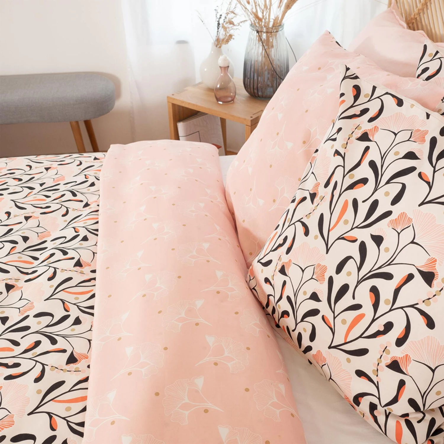 Cette parure de lit en coton bio et à la structure satin arbore des fleurs et des feuillages dans des teintes roses et orange pour une déco résolument romantique. De l’autre côté, c’est un rose pâle qui domine, mis en valeur par quelques pois dorés et des feuilles de Ginkgo Biloba blanches. Cet arbre aux mille écus a la réputation d’apporter la sérénité et la longévité. C’est parfait dans une chambre à coucher.