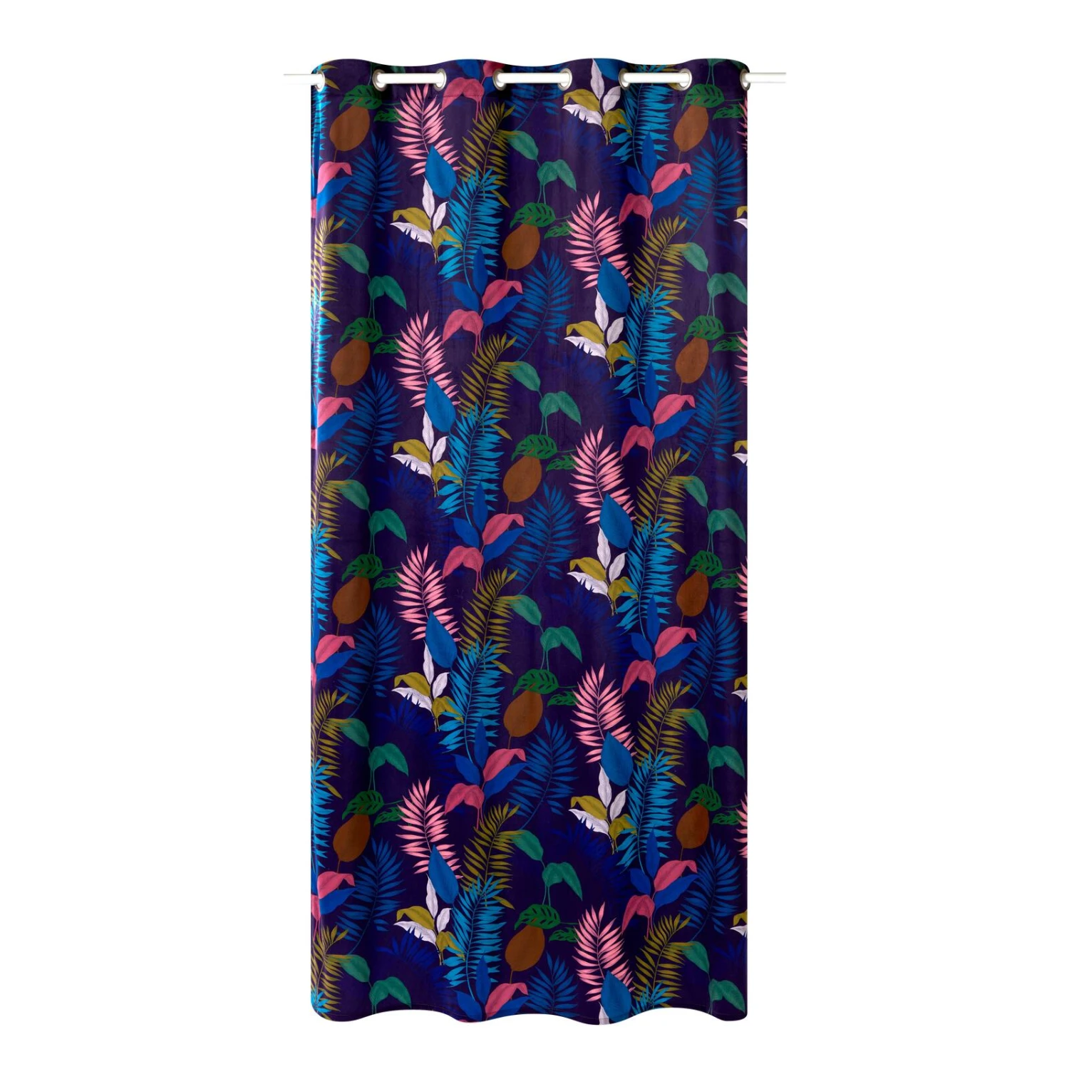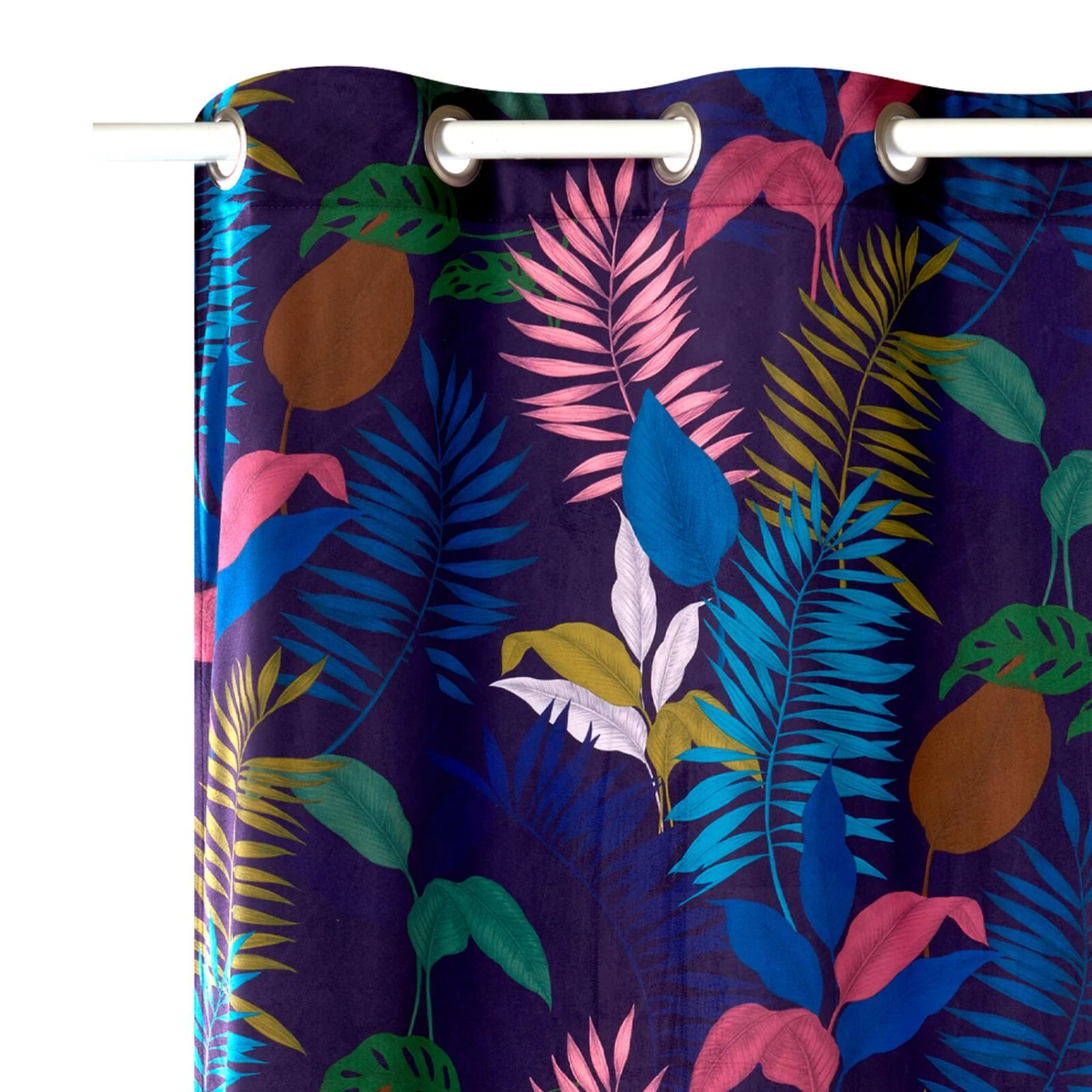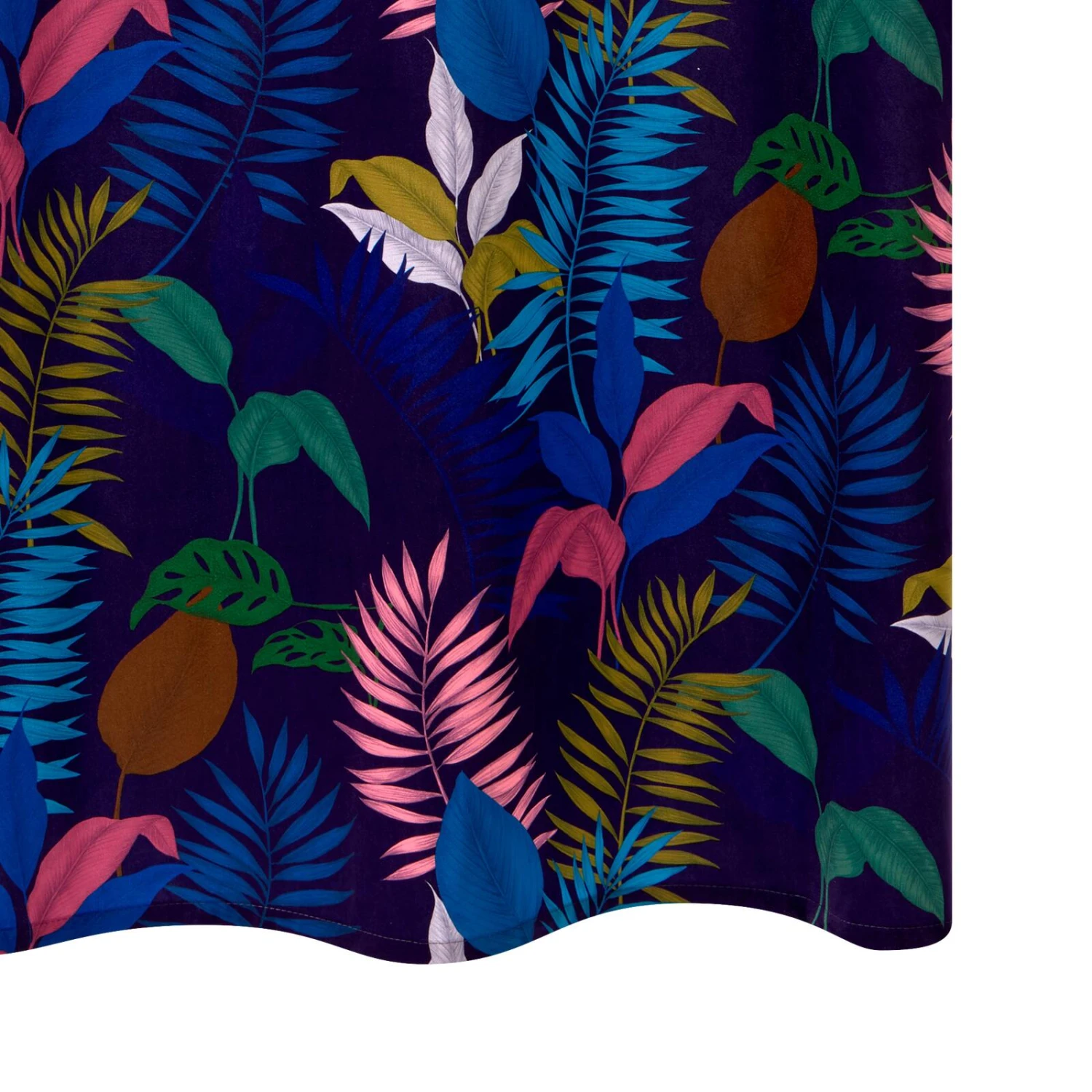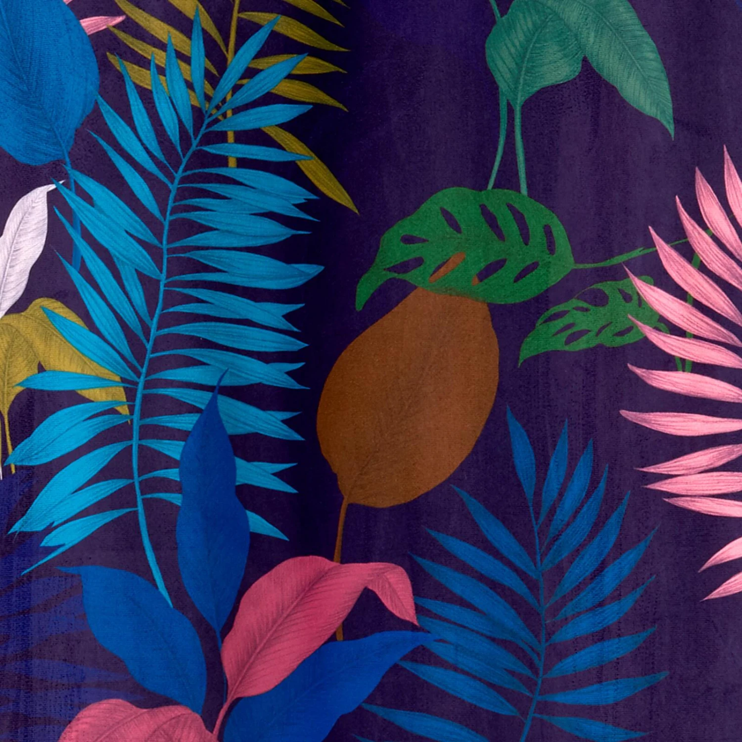 Sur un sublime bleu particulièrement propice aux rêveries, de larges motifs de feuillages colorés dansent au rythme des mouvements du rideau.