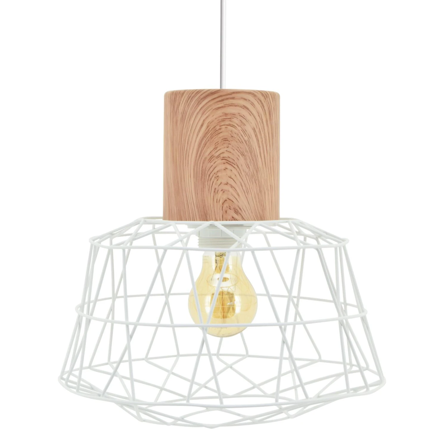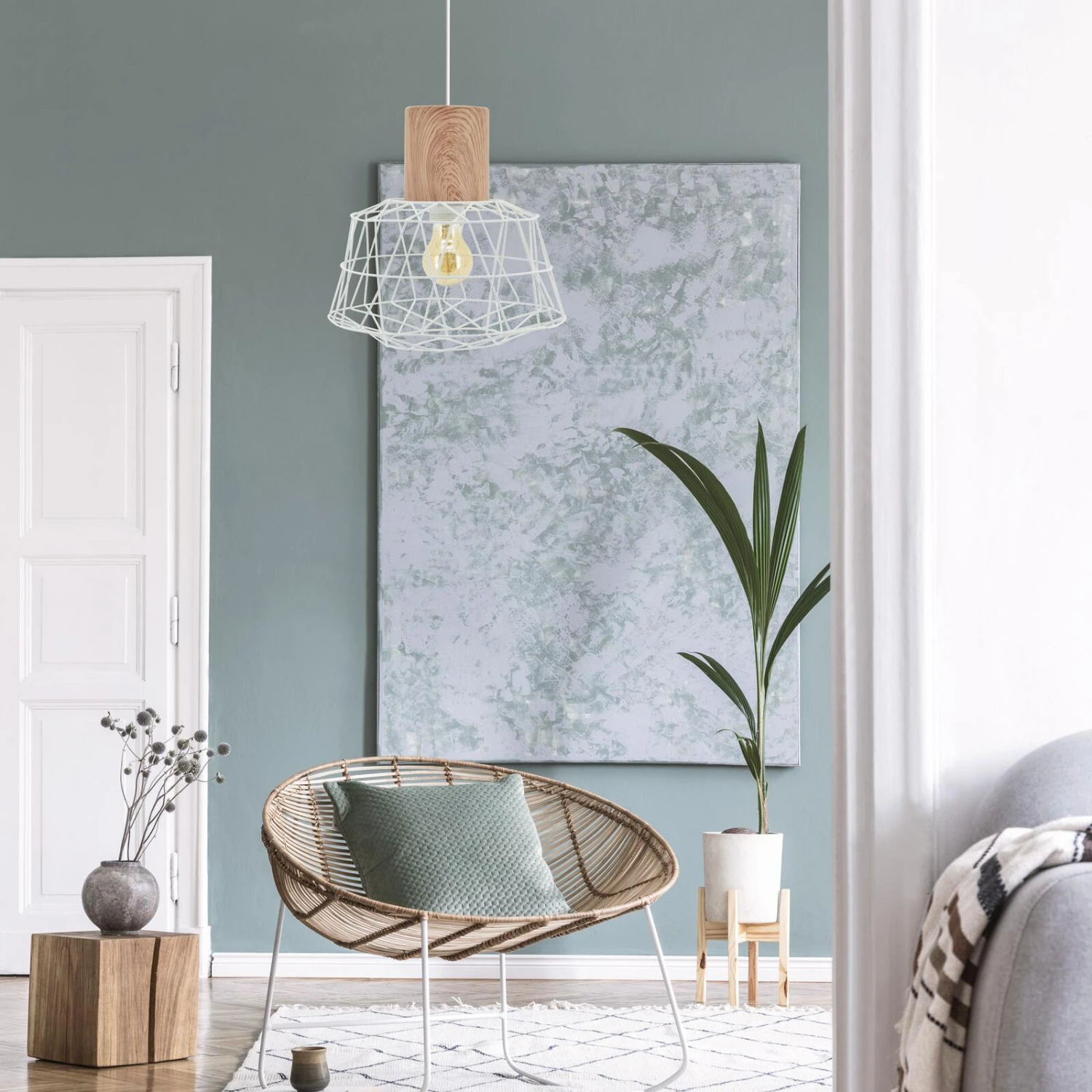 Dans une ambiance scandinave, plutôt nature et un brin minimaliste, la suspension HAPPY en bois et en métal blanc apporte une jolie note graphique à votre déco.
