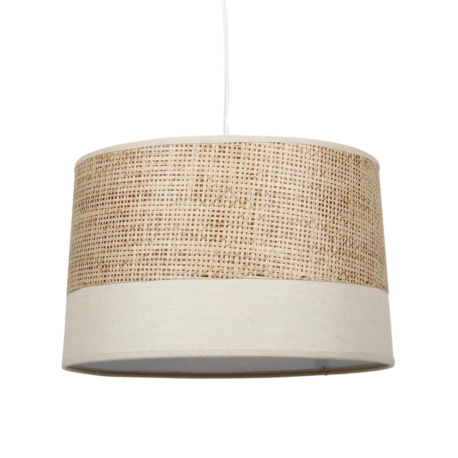 Ce luminaire cylindrique est composé de paille tressée, et une bande de tissu beige entoure son extrémité basse, lui donnant un aspect naturel mais aussi très doux et élégant.