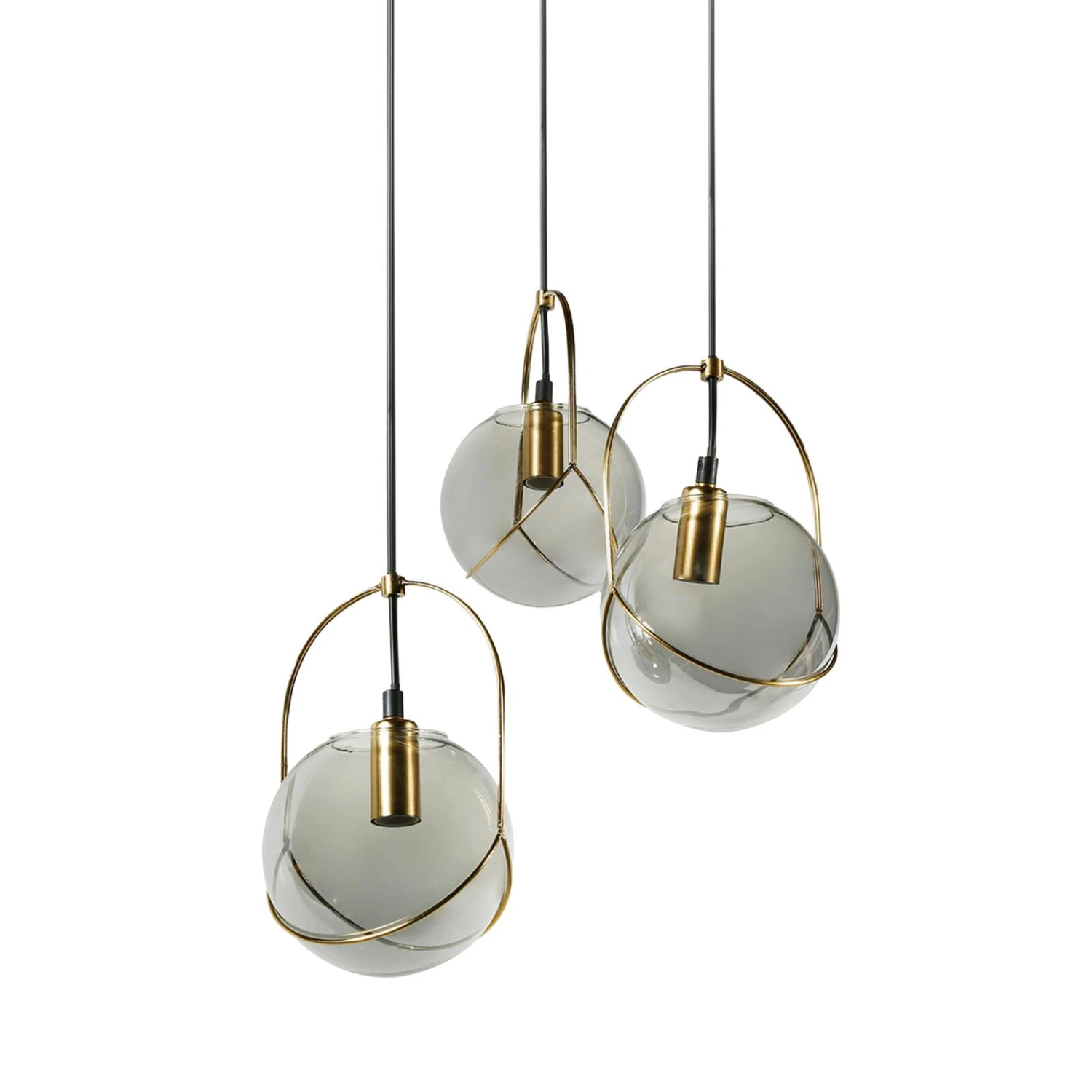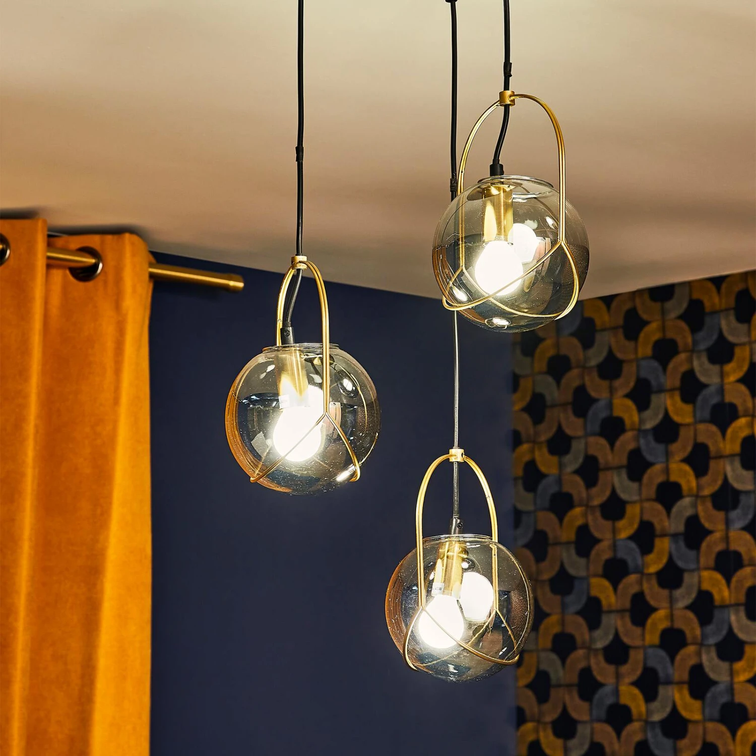 Craquez pour cette suspension triple EUGÉNIE ! Sa structure en métal doré et en verre fumé donnera une dimension chic à vos pièces et habillera votre plafond avec style.