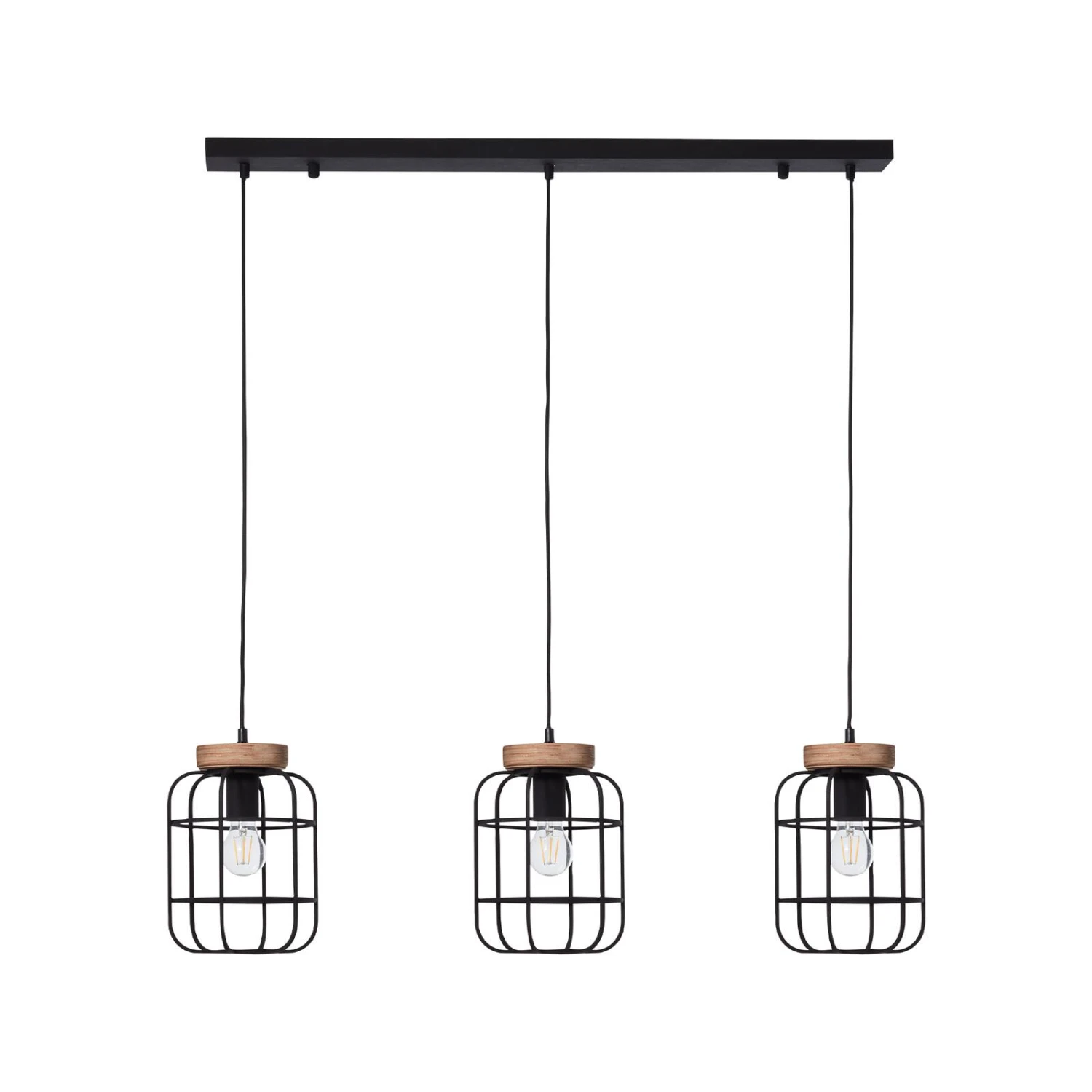 La suspension GWEN est composée de 3 sources lumineuses distinctes. À partir d’une structure rectangulaire en métal noir, les luminaires pendent vers le sol et forment 3 cages grillagées autour des ampoules. Chacun doté d’un socle en bois clair, le mélange des matières est ultra-harmonieux.
