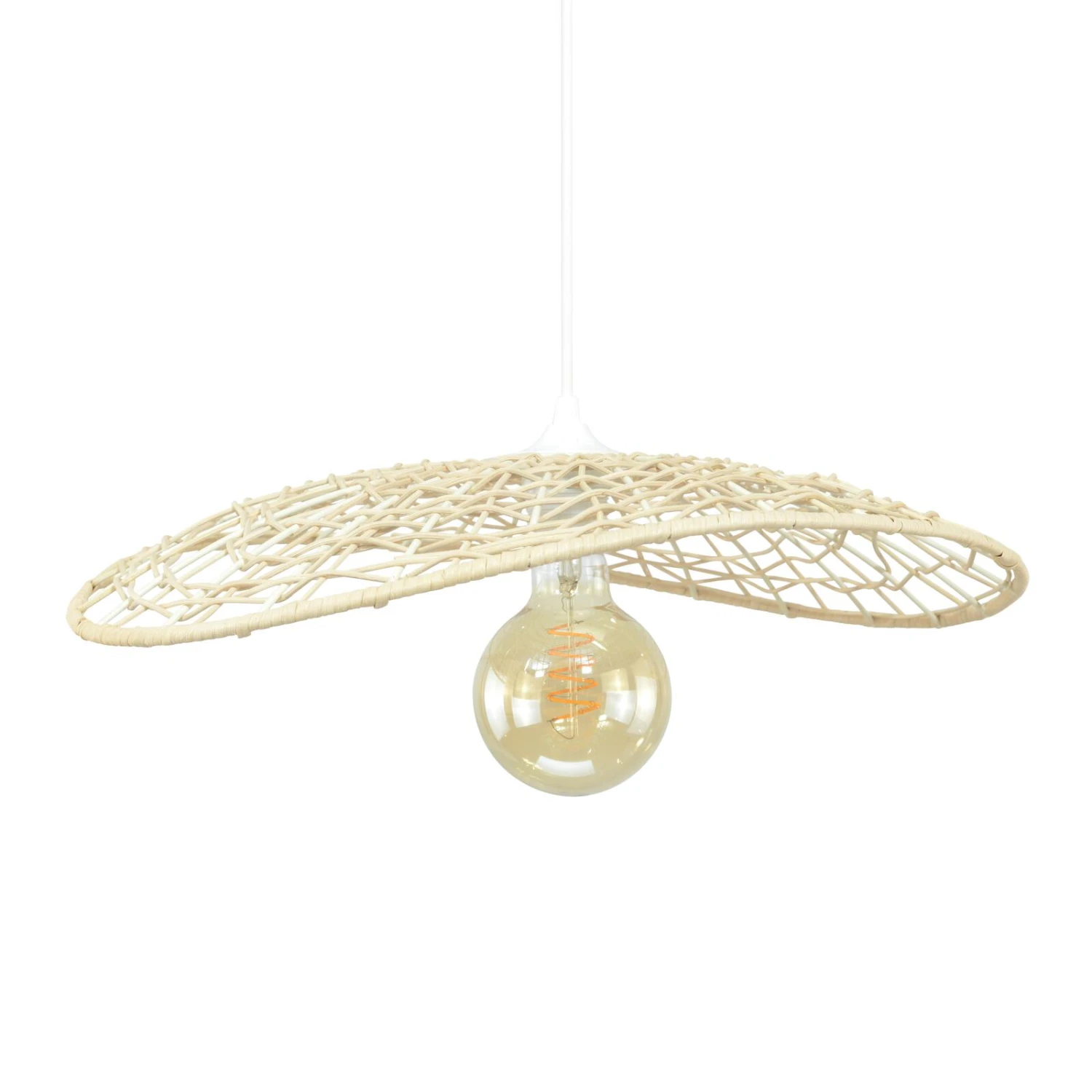 En cause ? Le rotin avec lequel elle a été confectionnée. Cette fibre naturelle a été tressée de manière à former un abat-jour circulaire de 50 centimètres de diamètre dont les bords possèdent une hauteur différente et qui laisse passer la lumière.