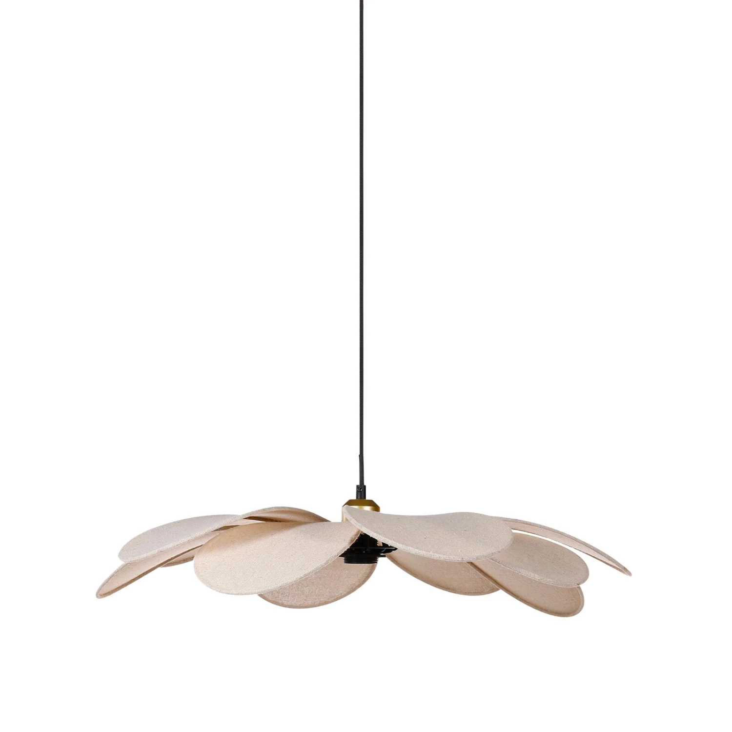 Cette suspension se compose d’un abat-jour en lin sur lequel plusieurs éléments se superposent, comme pour former les pétales d’une fleur. Cet abat-jour est surmonté d’un embout doré pour une note de chic, lui-même accroché à un câble noir de 115 centimètres.