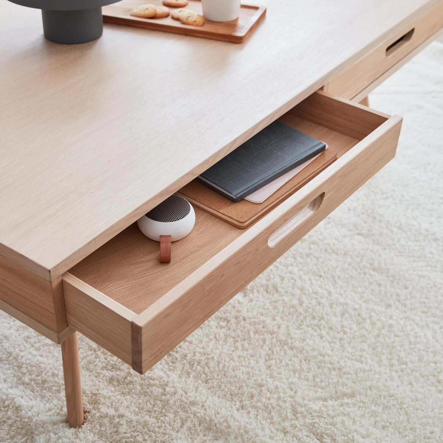 Un design épuré et efficace, une couleur de bois beige naturel, des pieds de biais : la table basse ZARA reprend les codes des décorations d’intérieur des pays nordiques. Cette table avec rangement dispose de grands tiroirs permettant de dissimuler les télécommandes par exemple. Vous gardez ainsi un salon désencombré où il fait bon vivre.