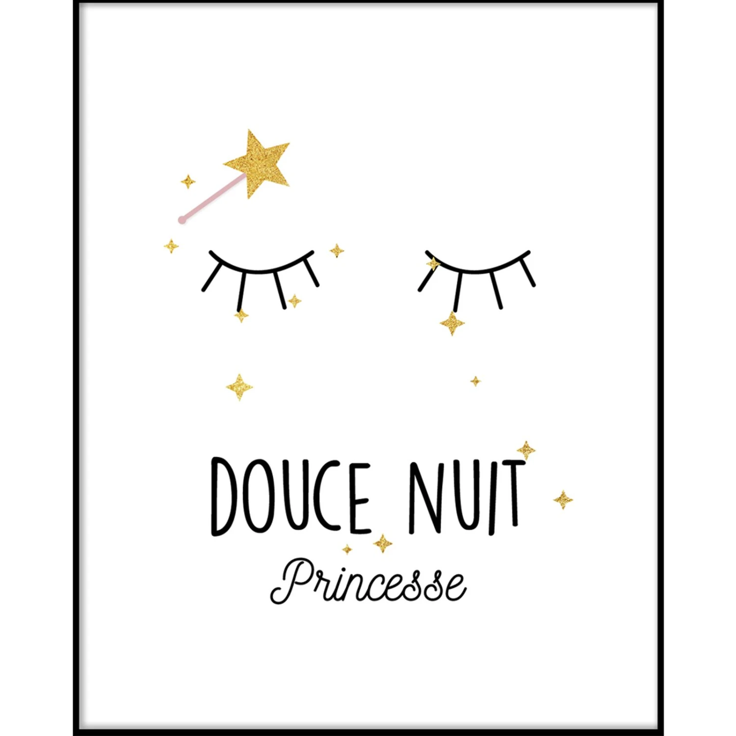 Dans une ambiance noire et blanche, agrémentée de petites étoiles dorées, cette illustration amène votre enfant dans un magnifique voyage au pays des princesses.