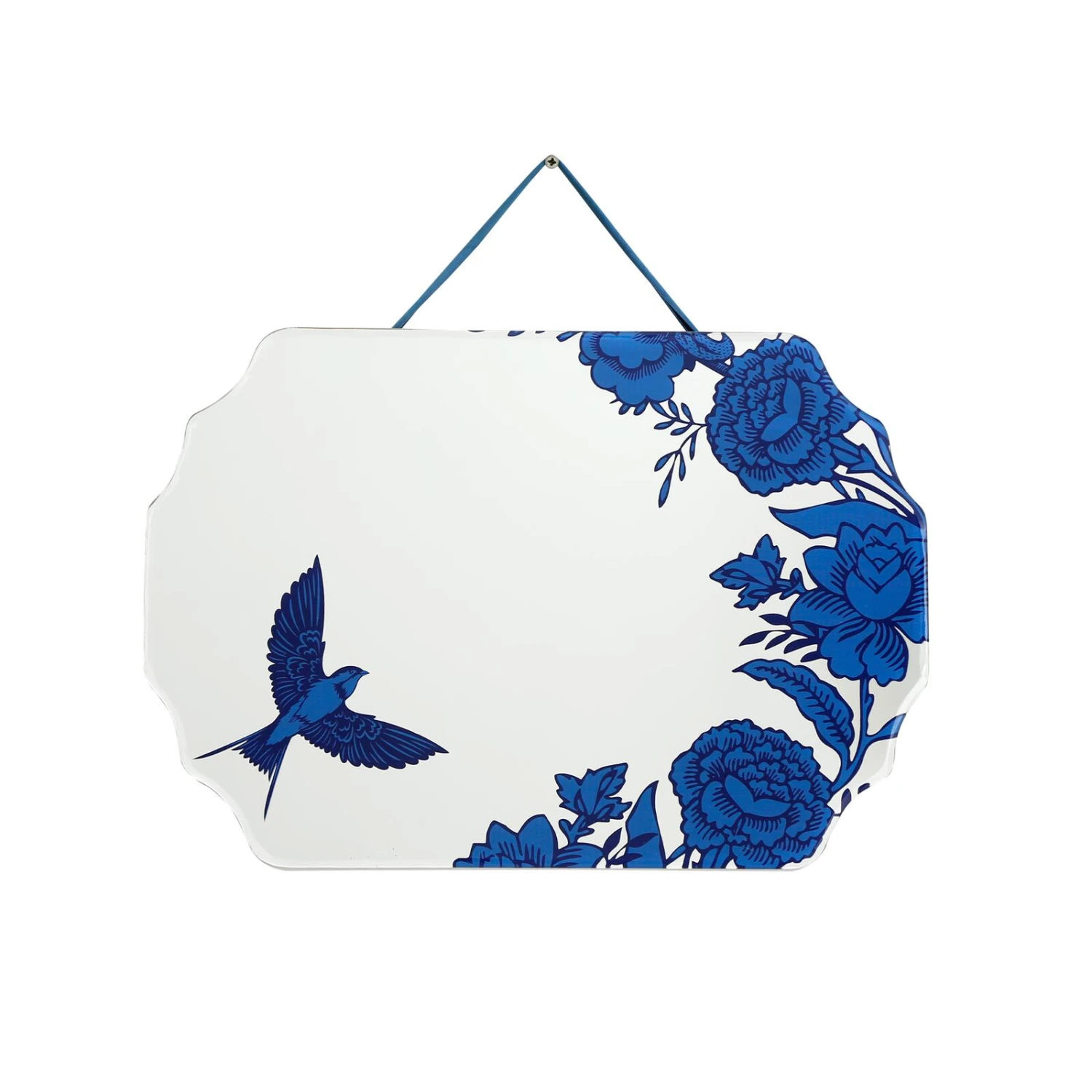 Sur ce miroir en verre est présentée une scène pleine de charme. Un oiseau, et plus spécifiquement une hirondelle, vole vers des fleurs entourées de feuillage. Tous les éléments de cette scène sont bleus, ce qui participe à faire de ce miroir un objet très romantique