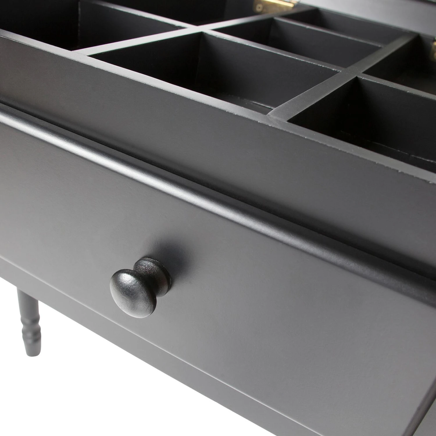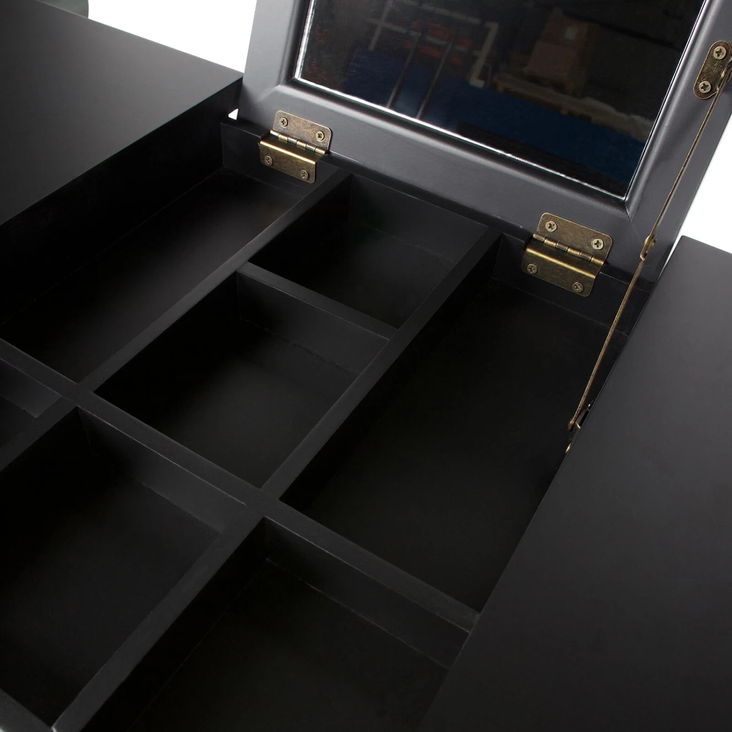 La console ROMY dispose d’un miroir de 28 cm dissimulé dans sa partie supérieure. Celui-ci se replie verticalement lorsque vous ne l’utilisez pas. Sous ce dernier se trouve un compartiment, caché lui aussi (on adore !), idéal pour organiser vos produits cosmétiques. Autant d’éléments qui la rendent encore plus surprenante !